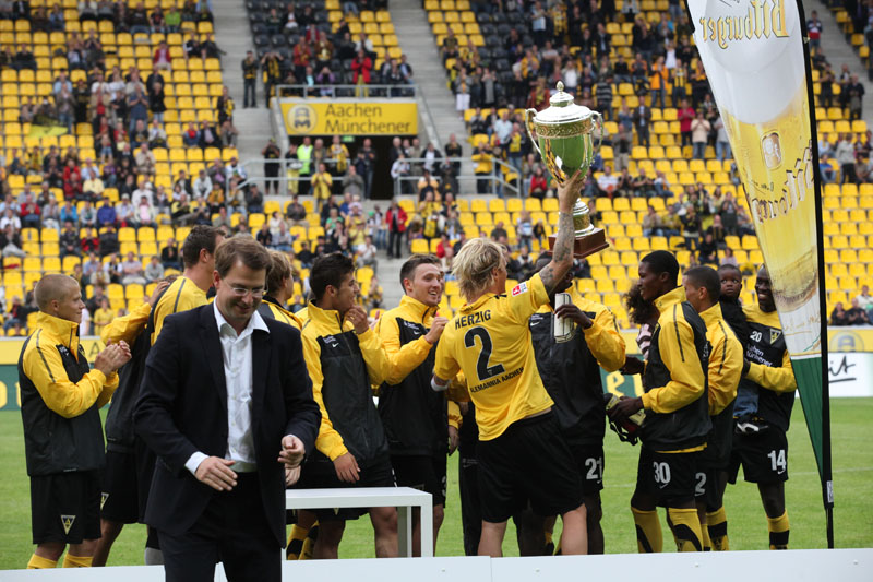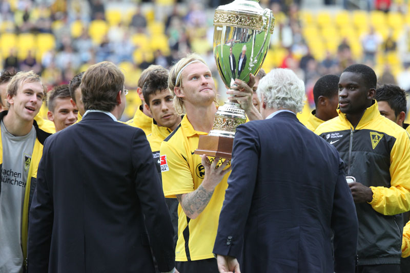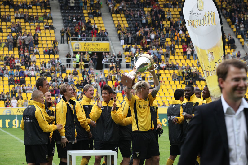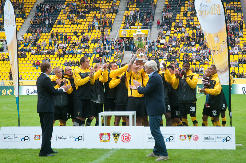 Kurz darauf war Schluss: Die Alemannia sicherte sich den Bitburger Derby Cup souverän vor Bayer Leverkusen und der Fortuna. Wie es sich für ein Turnier gehört, gab es natürlich auch einen Pokal, der Kapitän Nico Herzig durch Rudi Völler feierlich überreicht wurde. Was folgte war eine ausgelassene „Humba“ um die gewonnene Trophäe, die Lust auf mehr macht.