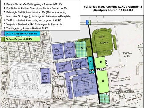 Diese sieht vor, dass neben dem Reitstadion das neue Stadion der Alemannia entstehen kann. Dafür stellt der ALRV freundlicherweise Flächen aus seinem Bestand zur Verfügung. Neben dem Stadion kann der Bundesliga-Aufsteiger außerdem fünf Trainingsplätze schaffen.
