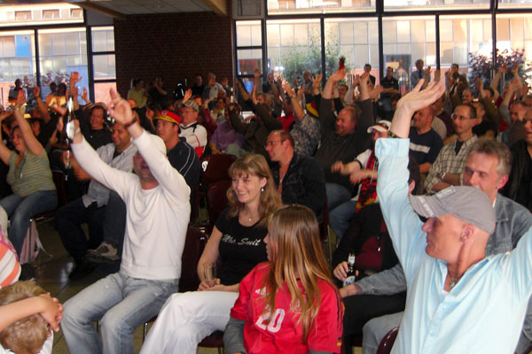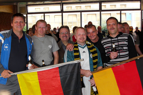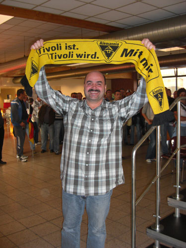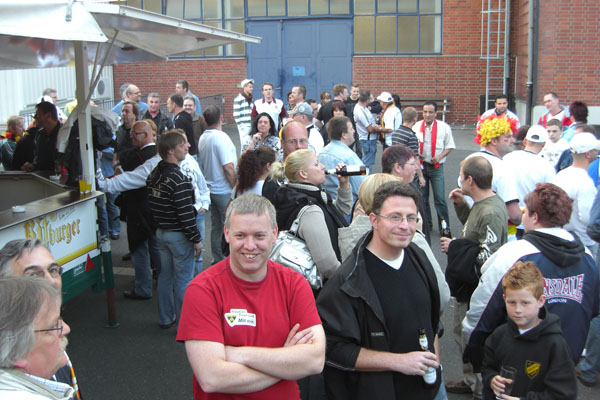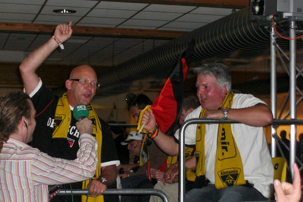 Zu dem Pils, das von Alemannias Bierpartner, der Bitburger Brauerei, bereitgestellt wurde und einigen Knabbereien, hatten die Mitarbeiter der Schumag AG noch einen zusätzlichen Würstchen und Getränke-Stand extra für dieses Event organisiert. „Das ist eine tolle Sache für den Zusammenhalt im Unternehmen und ein echtes Erlebnis für alle Mitarbeiter. Ich freue mich, dass wir das hier erleben dürften“, begründete der Gewinner noch einmal seine Teilnahme und sein Engagement für die Aktion.