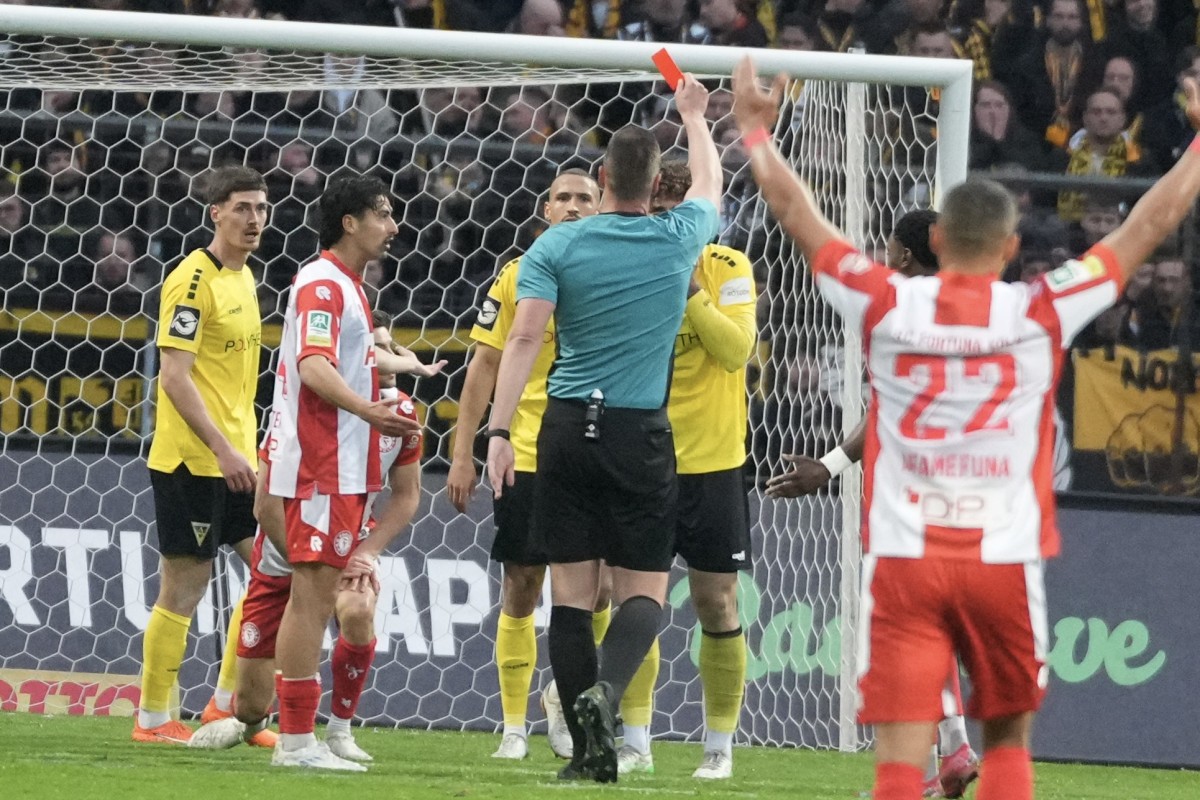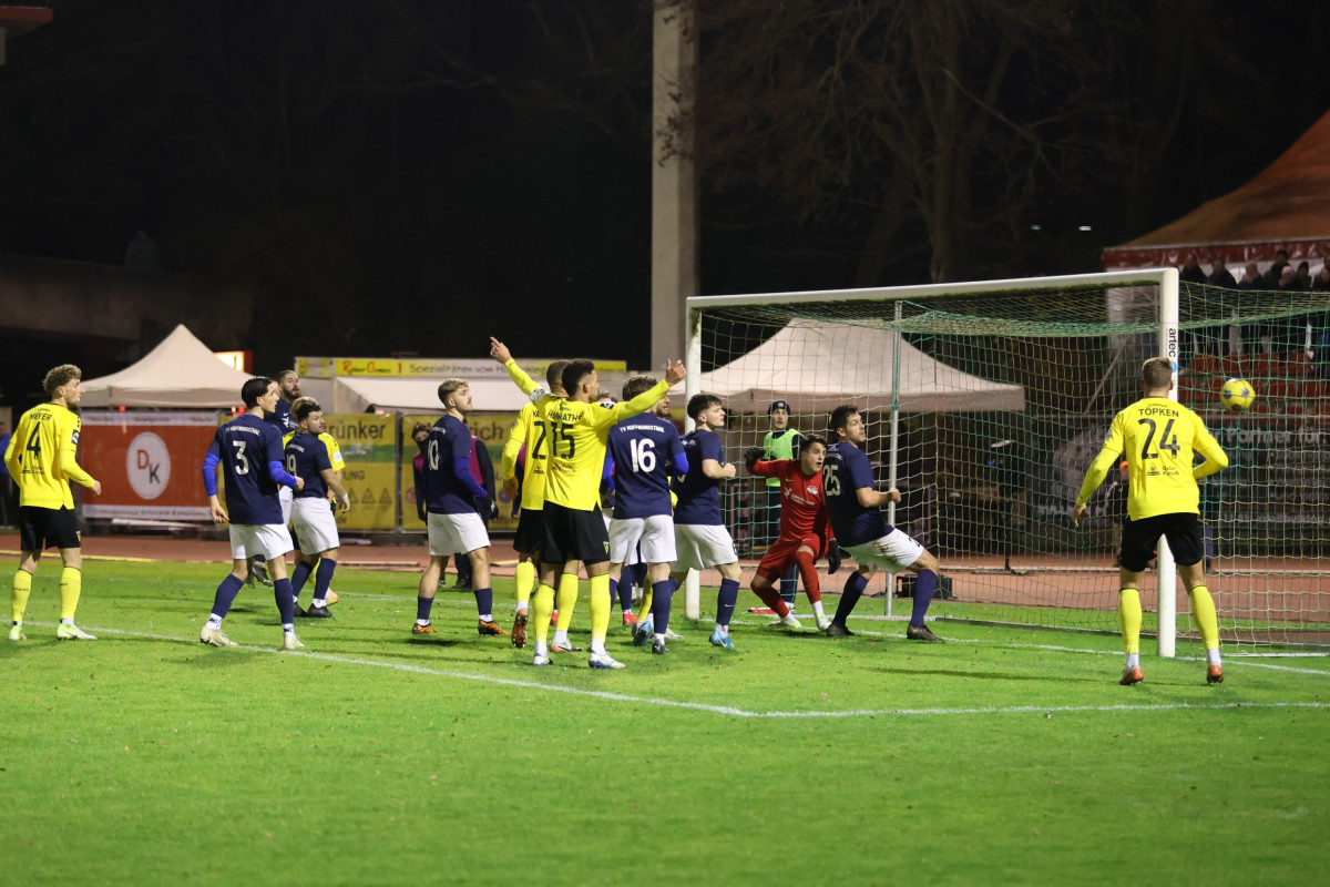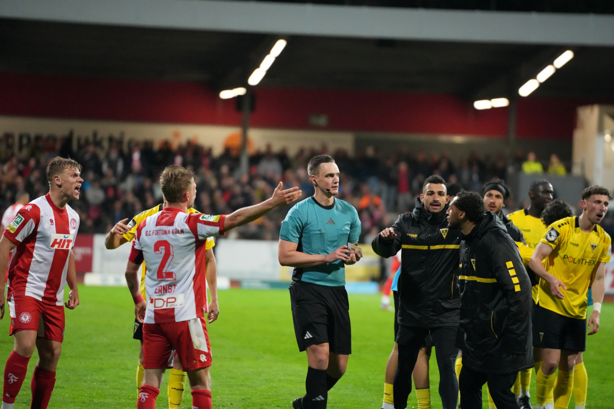Was im Südstadion auf die Alemannia wartete, war kein gewöhnliches Halbfinale. Fortuna Köln, rund 9000 Zuschauer und ein ausverkauftes Stadion bildeten die Kulisse für ein Spiel, das es in sich hatte. Die Aachener fanden kaum ins Spiel, Köln kombinierte sich immer wieder gefährlich vor das Tor von Jan Olschowsky. Der Schlussmann hielt sein Team mit mehreren Glanzparaden im Spiel – doch dann die nächste Schrecksekunde: In der 40. Minute musste Jan-Luca Rumpf nach einem Foul an Danny Breitfelder vor dem Strafraum mit Rot vom Platz. Unterzahl und noch mindestens 50 Minuten zu gehen.