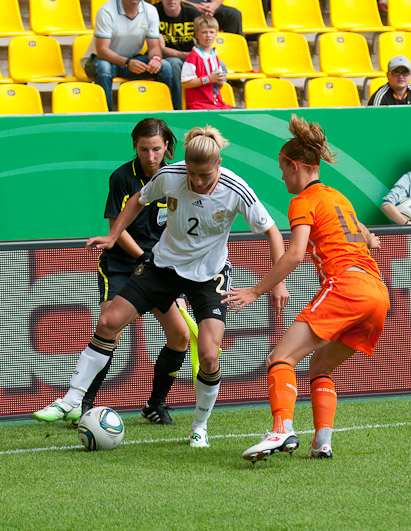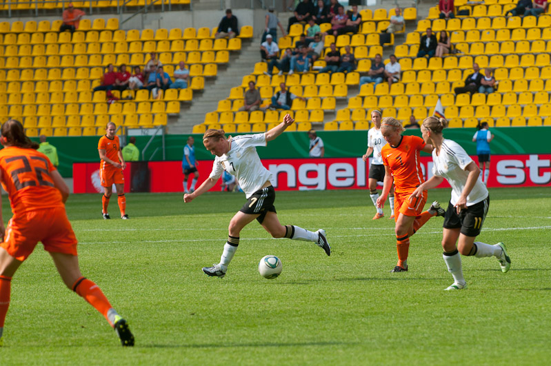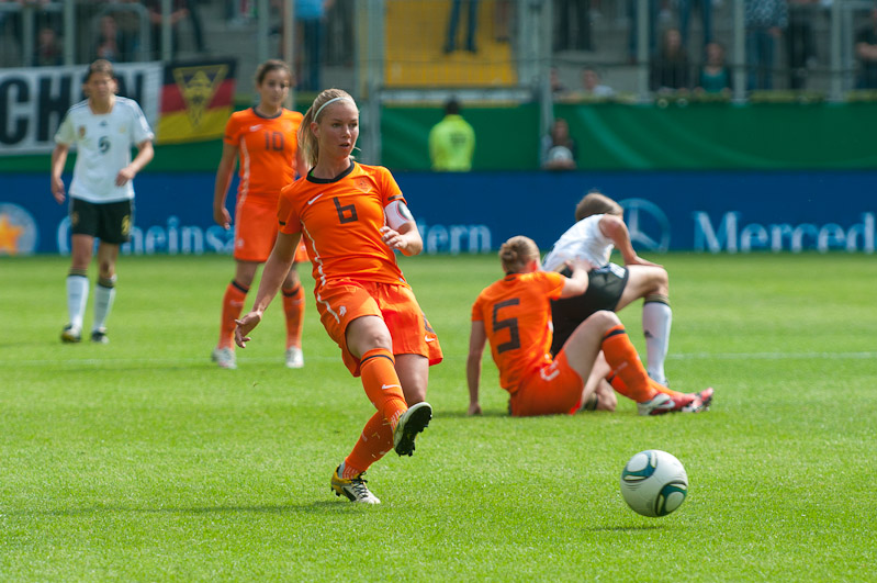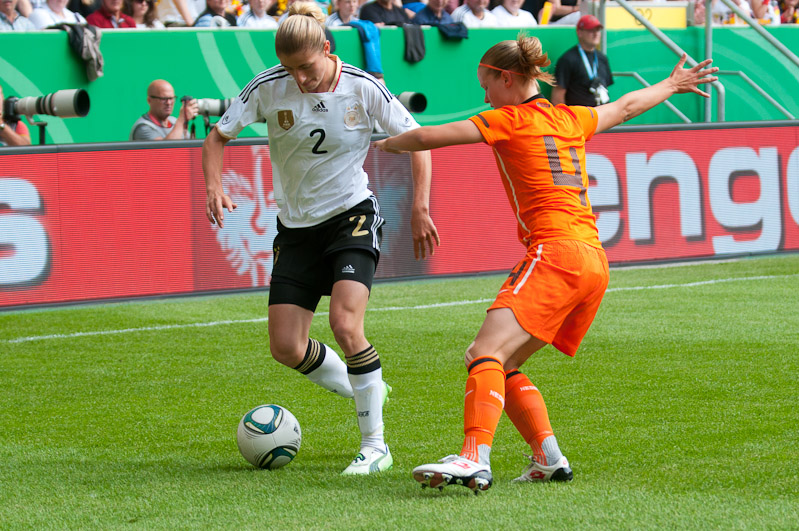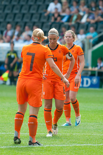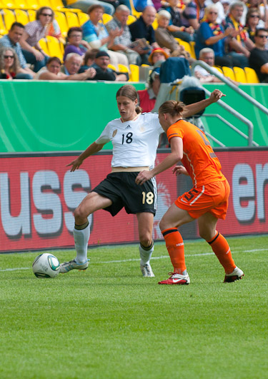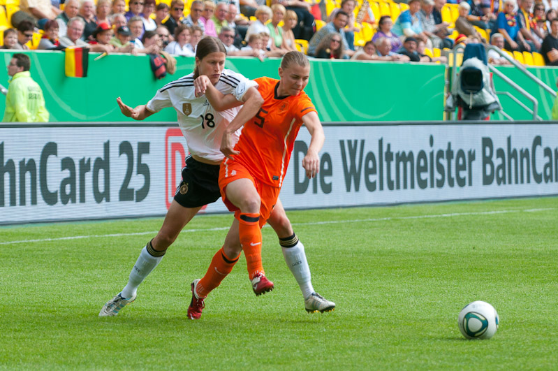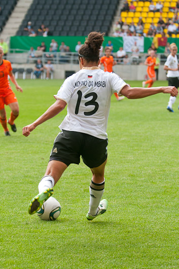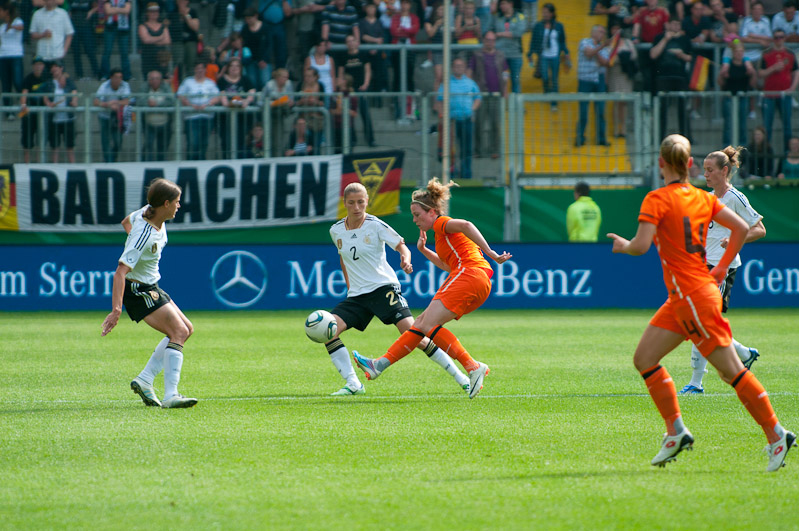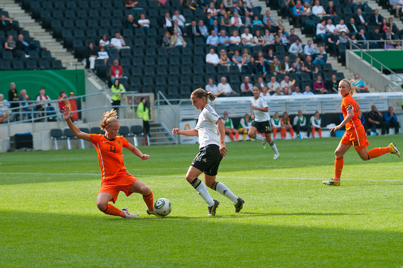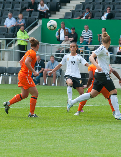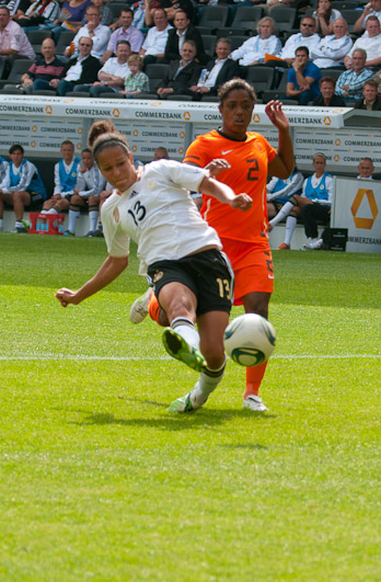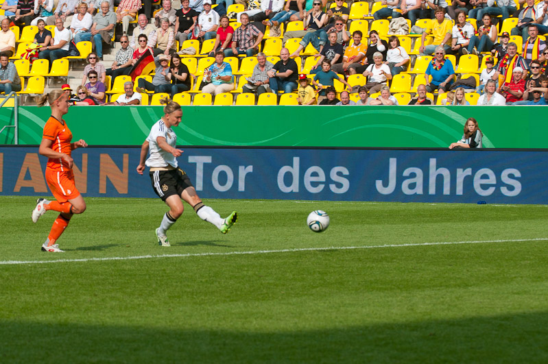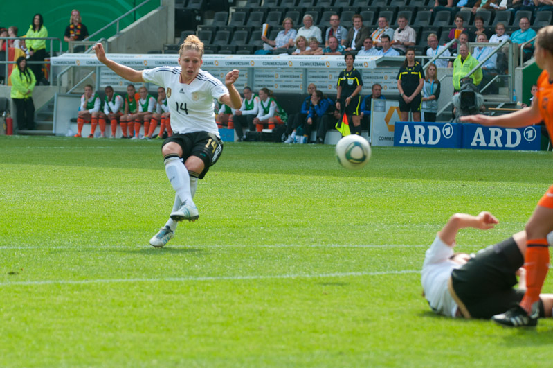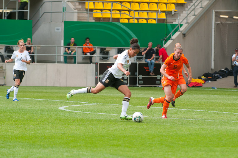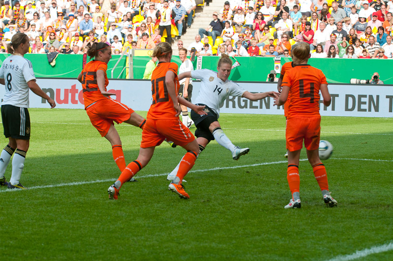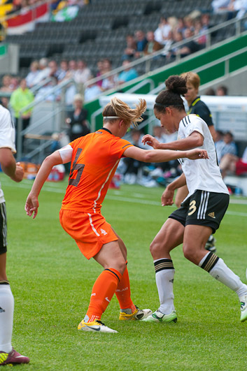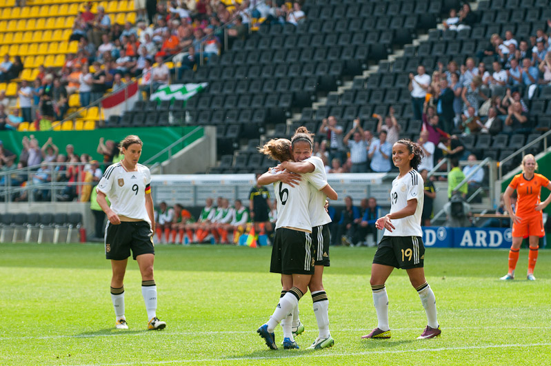 In der 41. Minute bewies Manon Melis, niederländische Rekord-Torschützin in Diensten des FC Malmö, ihre Klasse. Krahn war zu langsam, doch Nadine Angerer war beim folgenden Lupfer auf dem Posten. Als der nächste deutsche Angriff schon fast vereitelt schien, weil Prinz einfach zu lange brauchte, um den Ball unter Kontrolle zu bringen, legte die DFB-Elf doch noch nach. Laudehr zog nach innen und schlenzte die Kugel von der Strafraumgrenze in den Winkel – 2:0. Sekunden vor der Pause köpfte Okoyino da Mbabi nach Bajramaj-Ecke an den Pfosten.