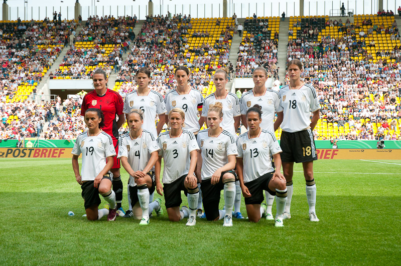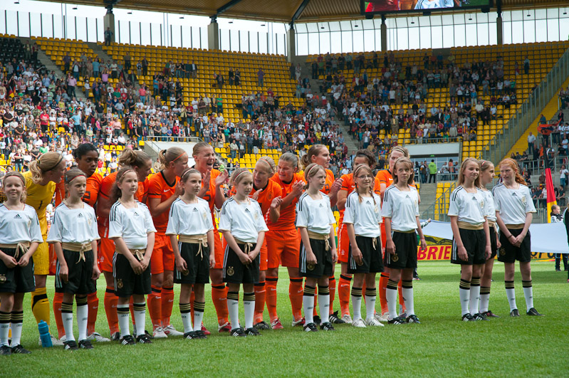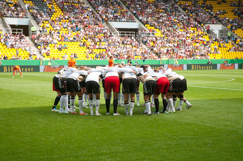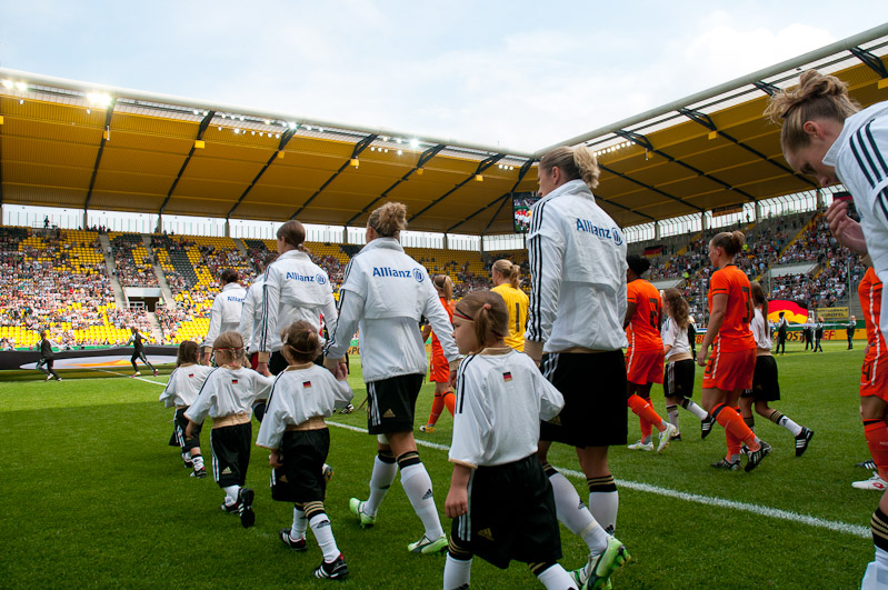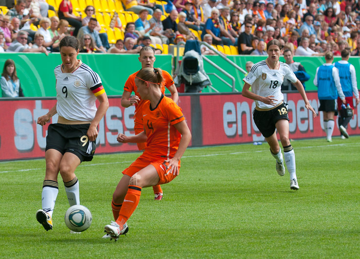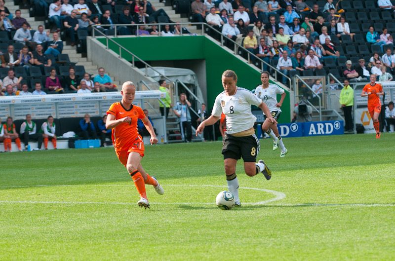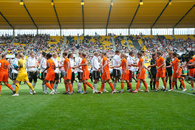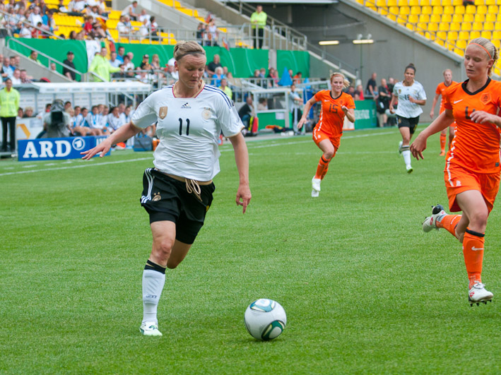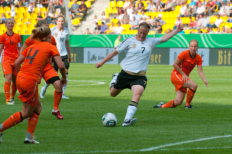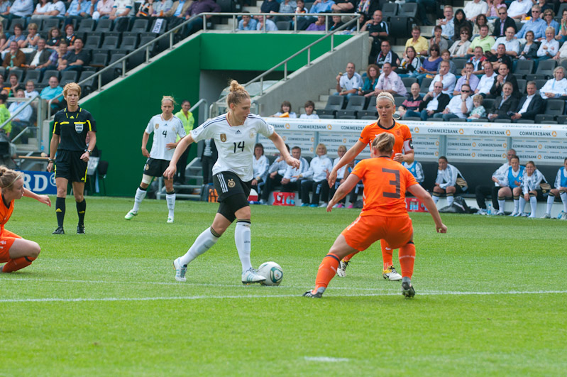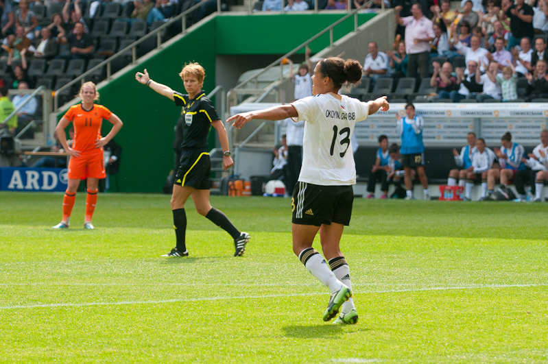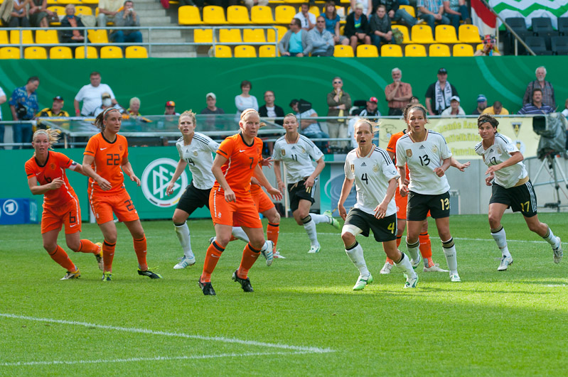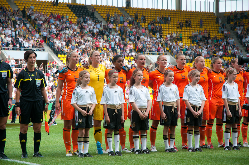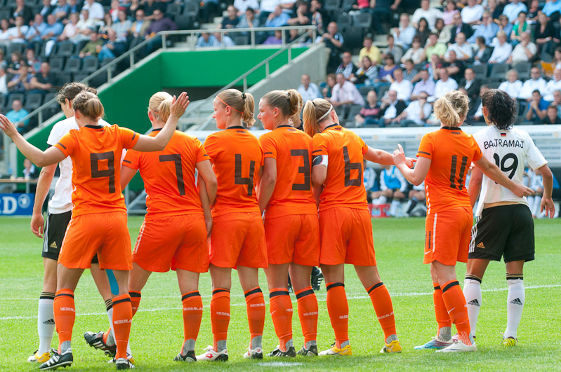 Drei Minuten später zeigte das DFB-Team seine ganze spielerische Klasse. Prinz steckte auf ihre Sturmpartnerin durch, und Okoyino da Mbabi schob überlegt zur deutschen Führung ein (15.). Die deutsche Abwehr um Annike Krahn und Saskia Bartusiak war auch nach 25 Minuten noch kein Mal ins Schwitzen gekommen – zu harmlos agierte die Elftal. Auf der anderen Seite war die deutsche Offensive trotz früher Ballgewinne nicht schnörkellos genug und spielte die Angriffe nicht konsequent zu Ende. Mal blieb Bajramaj hängen, mal jagte Babett Peter den Ball aus 18 Metern deutlich vorbei.