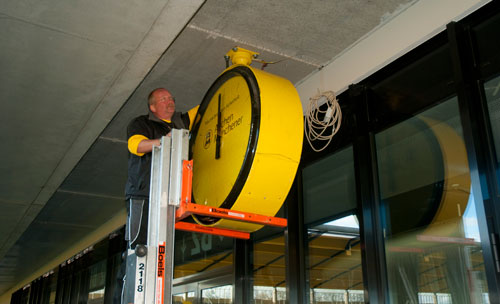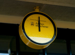 Im Herbst 1958, ein Jahr nach der Einweihung der Haupttribüne, wurde die Alemannia-gelbe Uhr mit den riesigen schwarzen Zeigern unterhalb des Tribünendaches des Tivoli aufgehängt, wo sie mehrere Jahrzehnte – mal mehr mal weniger präzise – die Uhrzeit anzeigte. Zum Pokalspiel gegen Bayern München am 4. Februar 2004 musste die Stadionuhr allerdings einem zusätzlichen Kamerapodest weichen. Zur Saison 2004/2005 wurde sie schließlich wieder angebracht. Ihren Kultstatus erlangte sie durch die Durchsagen von Robert Moonen, der kurz vor Anpfiff stets die Anstoßzeit mit Hinweis auf die Uhr über den Sitzplätzen durchsagte. Nach der Montage im neuen Tivoli könnte es am Montag also wieder heißen „20.15 auf der Stadionuhr“.