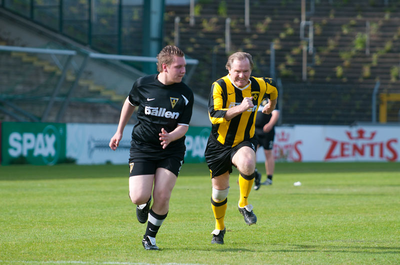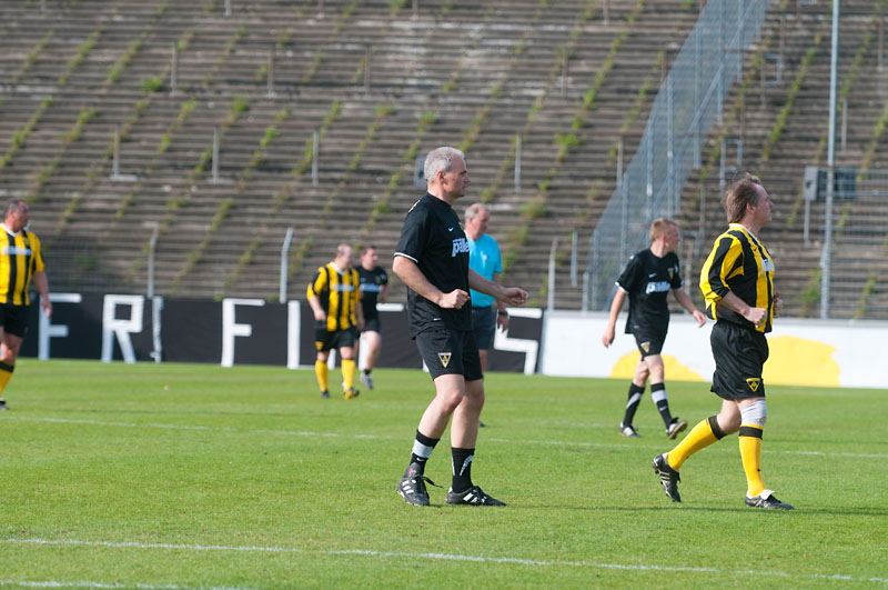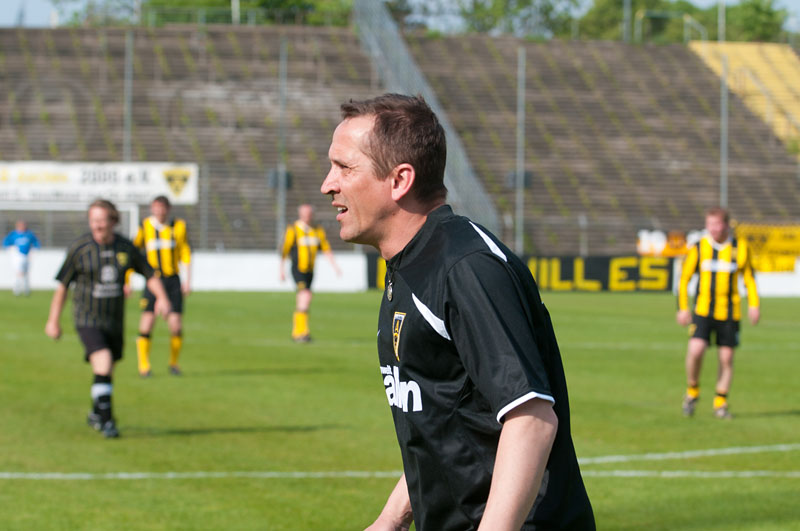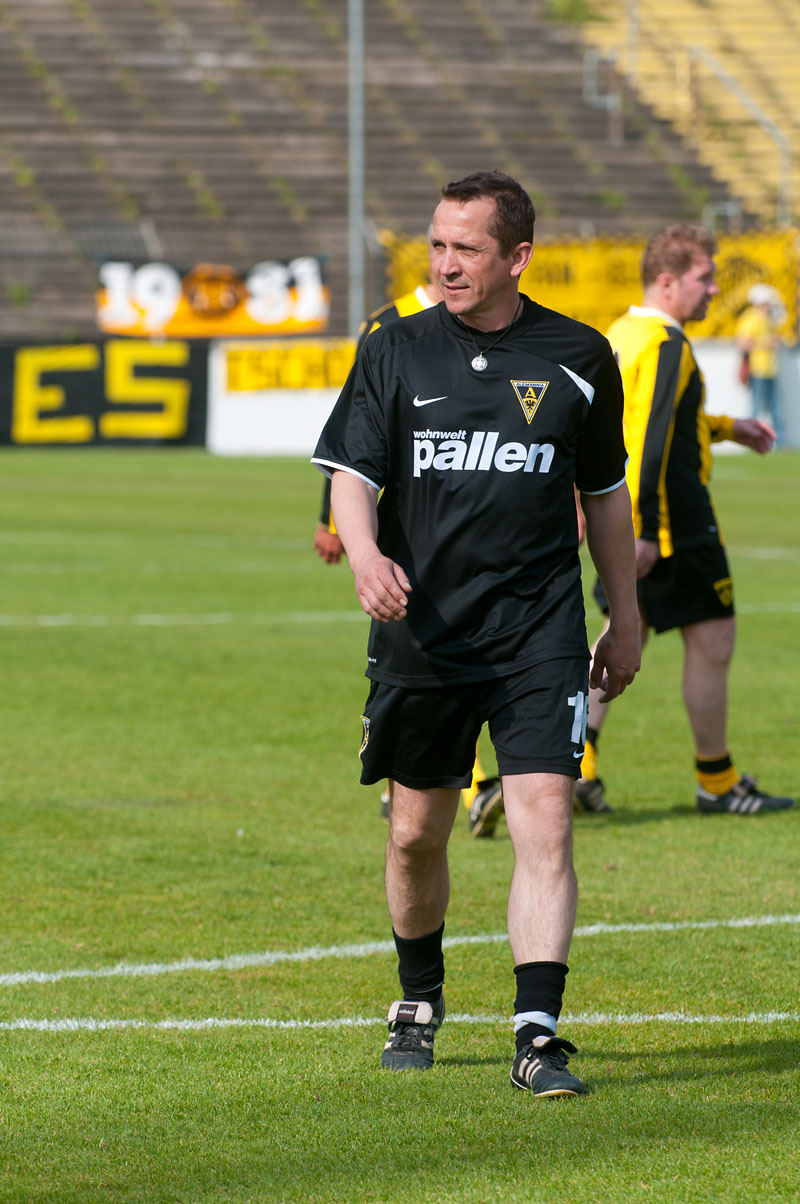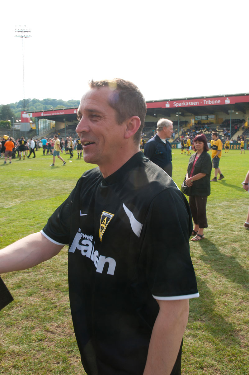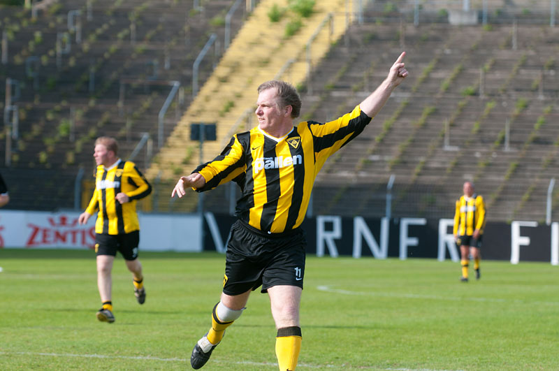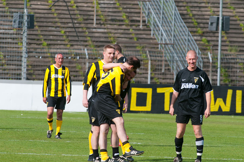 Das Ergebnis fiel am Ende mit 13:1 für die ehemaligen Profis deutlich aus. Doch das Resultat – da waren sich letztlich alle einig – war nur Nebensache. Es ging um viel mehr; für alle Beteiligten war es ein Abschied der besonderen Art. „Das ist ganz klar ein Abschied fürs Herz“, brachte es Stephan Lämmermann treffend auf den Punkt. „Lämmi“ war zusammen mit seinem ehemaligen Kollegen Mike Zimmermann nicht etwa auf dem Spielerbogen der Traditionself zu finden, sondern der Ex-Torjäger gesellte sich in die Reihe der Fans. Und für die war es ebenfalls ein unbeschreibliches Gefühl, einmal die Schuhe auf dem alten Rasen schnüren zu dürfen. „Ich habe als Fan immer schon davon geträumt, einmal hier auf dem Platz zu stehen. Dass dieser Traum nun in Erfüllung geht, ist großartig. Doch dass ich auch noch zu denjenigen gehören darf, die beim allerletzten Spiel dabei sind, ist umso schöner“, verriet Rolf Gerwert vom Fanclub Schwarz-Gelb 81, der für sein 30-Jähriges Club-Jubiläum wahrlich keinen besseren Rahmen hätte finden können.