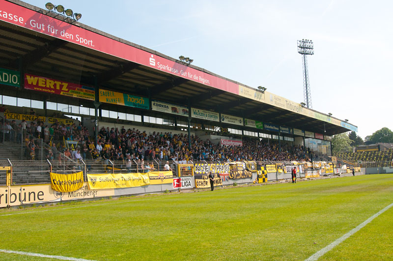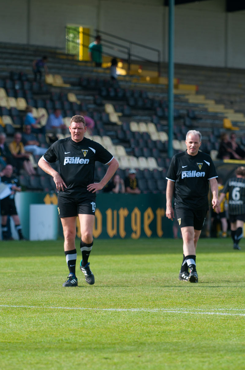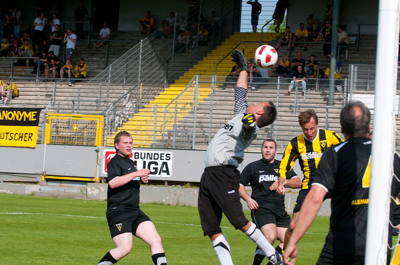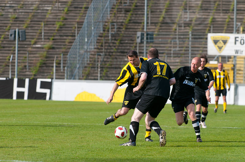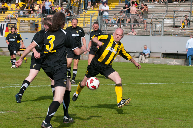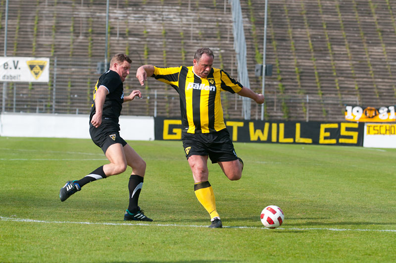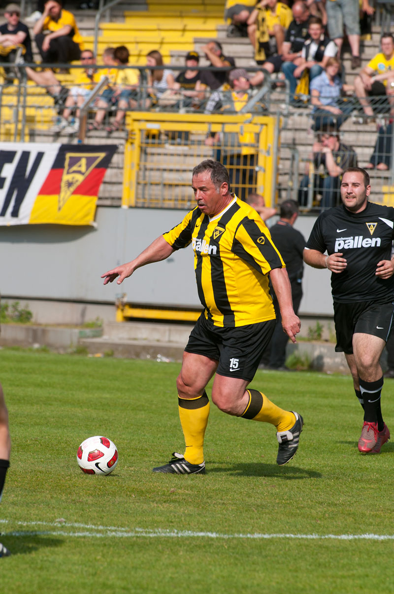 Das Ergebnis fiel am Ende mit 13:1 für die ehemaligen Profis deutlich aus. Doch das Resultat – da waren sich letztlich alle einig – war nur Nebensache. Es ging um viel mehr; für alle Beteiligten war es ein Abschied der besonderen Art. „Das ist ganz klar ein Abschied fürs Herz“, brachte es Stephan Lämmermann treffend auf den Punkt. „Lämmi“ war zusammen mit seinem ehemaligen Kollegen Mike Zimmermann nicht etwa auf dem Spielerbogen der Traditionself zu finden, sondern der Ex-Torjäger gesellte sich in die Reihe der Fans. Und für die war es ebenfalls ein unbeschreibliches Gefühl, einmal die Schuhe auf dem alten Rasen schnüren zu dürfen. „Ich habe als Fan immer schon davon geträumt, einmal hier auf dem Platz zu stehen. Dass dieser Traum nun in Erfüllung geht, ist großartig. Doch dass ich auch noch zu denjenigen gehören darf, die beim allerletzten Spiel dabei sind, ist umso schöner“, verriet Rolf Gerwert vom Fanclub Schwarz-Gelb 81, der für sein 30-Jähriges Club-Jubiläum wahrlich keinen besseren Rahmen hätte finden können.