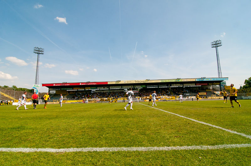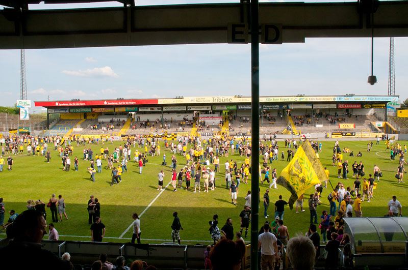 Lange Schlangen an den Stadioneingängen, eine gut gefüllte überdachte Stehplatztribüne und eine Atmosphäre wie am Spieltag: Alemannias alter Tivoli zeigte sich am Wochenende in seinen letzten Stunden nochmals von seiner besten Seite. Nachdem bereits vor knapp zwei Jahren das letzte Pflichtspiel der Profis der Schwarz-Gelben im altehrwürdigen Stadion erfolgreich bestritten wurde, gab es auch für Alemannias U23 am Samstagnachmittag mit einem 3:1-Erfolg gegen ETB Schwarz-Weiß Essen einen krönenden Abschluss zu feiern. Das letzte Punktspiel am alten Tivoli war gegen 16:47 Uhr offiziell beendet, doch ein finales Highlight sollte noch folgen.
