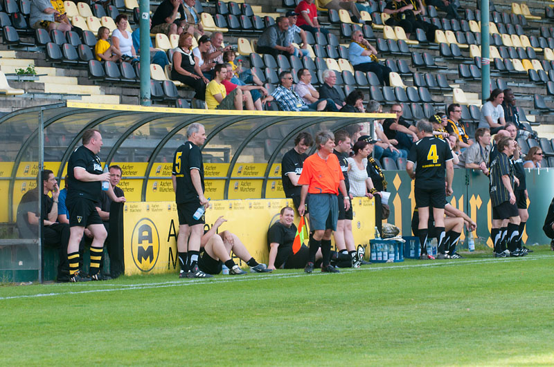 Passend zu allen wunderbaren Erinnerungen an das alte Wohnzimmer der Schwarz-Gelben, mit denen sich über 2.000 Besucher am Samstag offiziell von der ehemaligen Spielstätte verabschiedeten, wurde nochmals der Bogen in die Vergangenheit geschlagen. Und wie schlägt man diesen Bogen wohl besser, als mit den großen Idolen, die allesamt ihre eigenen Geschichten am Aachener Tivoli schrieben? Nicht zufällig versammelten sich daher Persönlichkeiten wie Jupp Martinelli, Jo Montanes oder Günter Delzepich ein allerletztes Mal im engen Spielertunnel, ehe es nochmals auf den Rasen ging. Alemannias Traditionsmannschaft gebührte die Ehre, in einem Freundschaftsspiel gegen eine Fanauswahl den Schlusspunkt unter 83 Jahre Tivoli-Geschichte zu setzen.