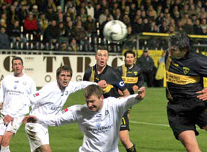 Ganz und gar nicht überirdisch verlief allerdings das Spiel. Besonders vor der Pause gab es kaum ein Durchkommen gegen die Abwehrkünstler aus dem Erzgebirge. „Wir hatten uns vorgenommen, kontrolliert und geduldig an die Sache heranzugehen“, sagt Klitzpera. „Manchmal geht es gegen solche Teams dann nur mit einer Standardsituation.“ Genau die funktionieren bei den Schwarz-Gelben in schöner Regelmäßigkeit. Natürlich ärgert sich auch der Abwehrchef über das Gegentor, das unglücklicher kaum hätte fallen können. Erst rutscht der Ball Moses Sichone über den Fuß, die abgefälschte Flanke kann Klitzpera nur an den Pfosten lenken. Den Rest besorgt Ersin Demir. „Ich hatte keine Wahl, musste irgendwas versuchen. Aber ich hatte kaum Zeit zu reagieren“, erinnert sich Klitze.