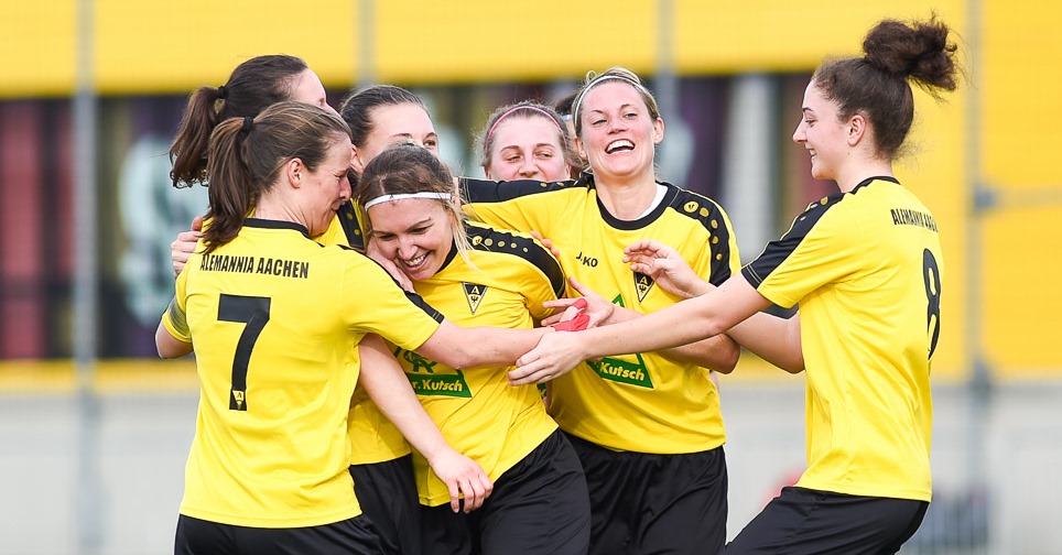 Jubel bei den Fußballerinnen von Alemannia Aachen. Im Schatten des Tivoli haben Alemannias Frauen am Sonntag die Warendorfer Sportunion besiegt. Svenja Streller schoss auf dem Parkdeck in Minute 16 das Tor des Tages zum 1:0.
