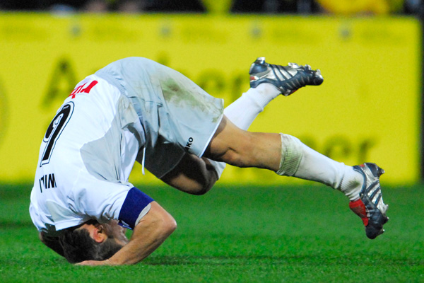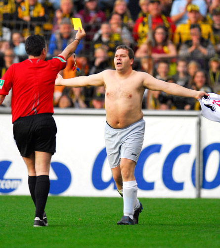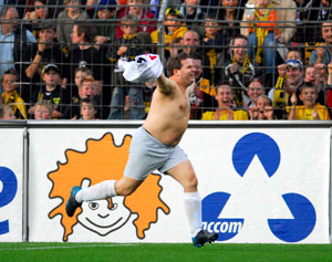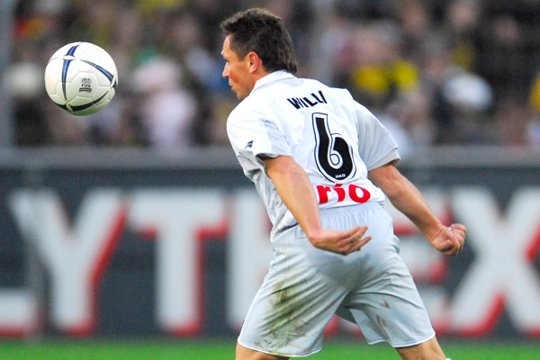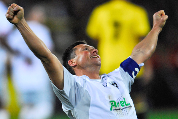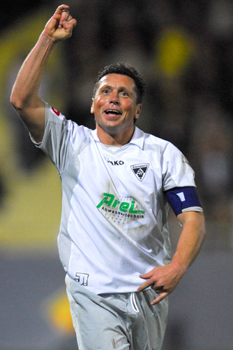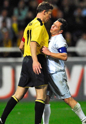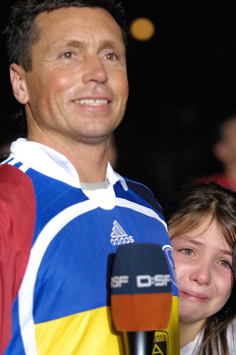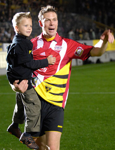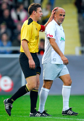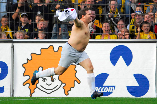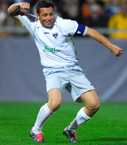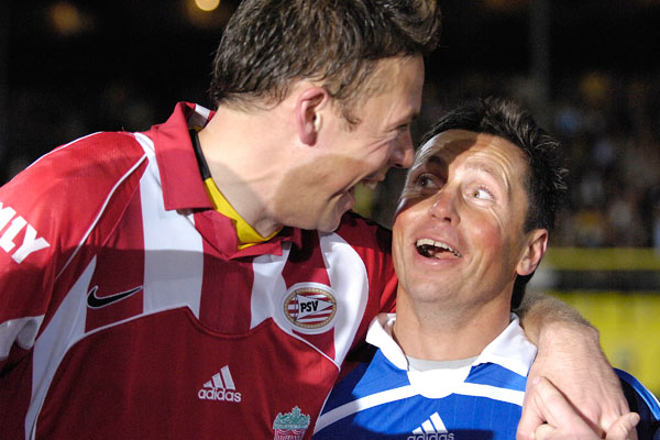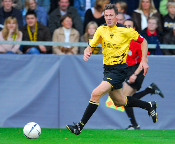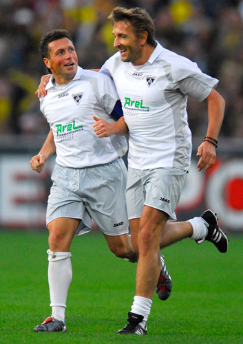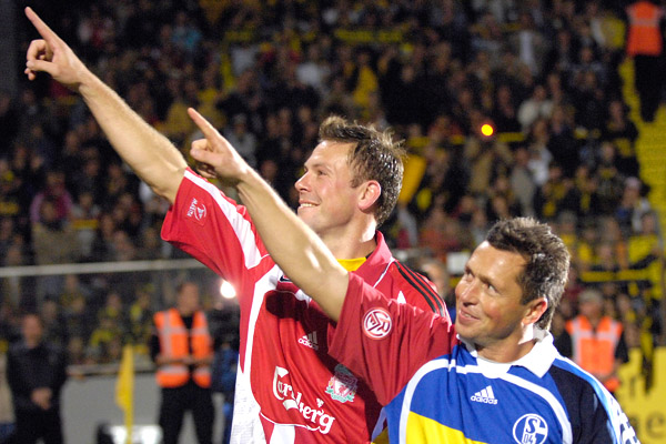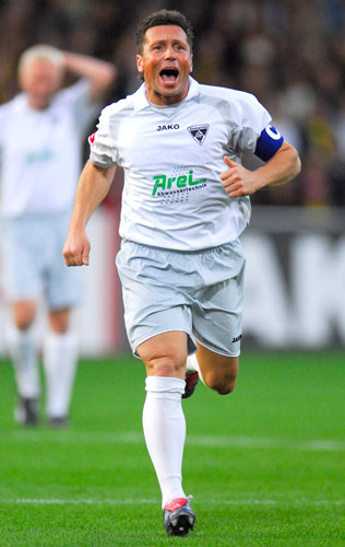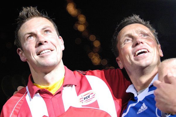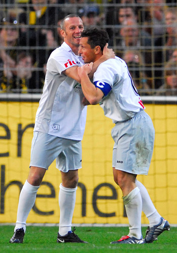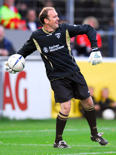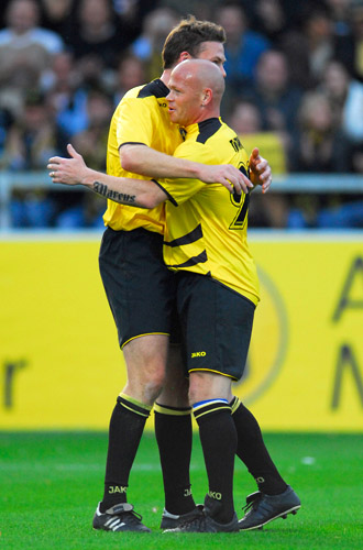 Schon am Nachmittag gab es im Hotel Quellenhof beim gemeinsamen Kaffee der beiden Mannschaften ein riesiges Hallo. Das Einlaufen der Teams ins Stadion – eins aus dem Löwengang, eins aus dem Marathontor – wurde dann für die Fans auf den Rängen auch zur Reise in die Vergangenheit. Stephan Lämmermann, Bachirou Salou, Eric van der Luer, Dennis Brinkmann, Stefan Blank und Kalla Pflipsen wurden begeistert empfangen. Wie es sich gehört, hoben sich die beiden Protagonisten des Abends ihren umjubelten Auftritt bis zum Schluss auf. Vor dem Anpfiff gab es für Erik noch eine besondere Überraschung: Im Kostüm des Alemannia-Maskottchens Al-Aix hatte sich sein bester Freund Christoph Hauser versteckt.