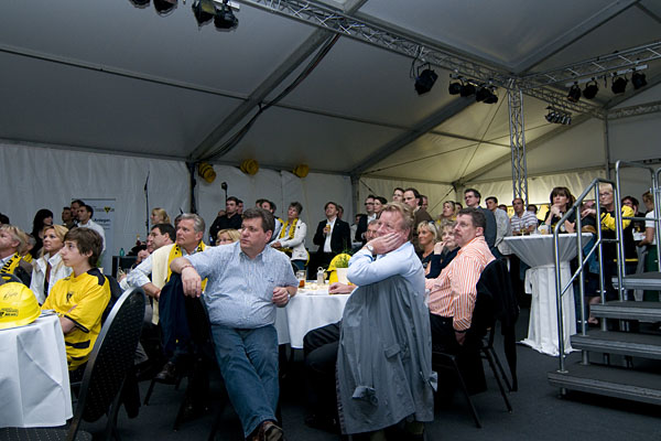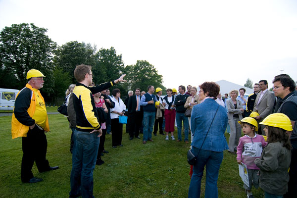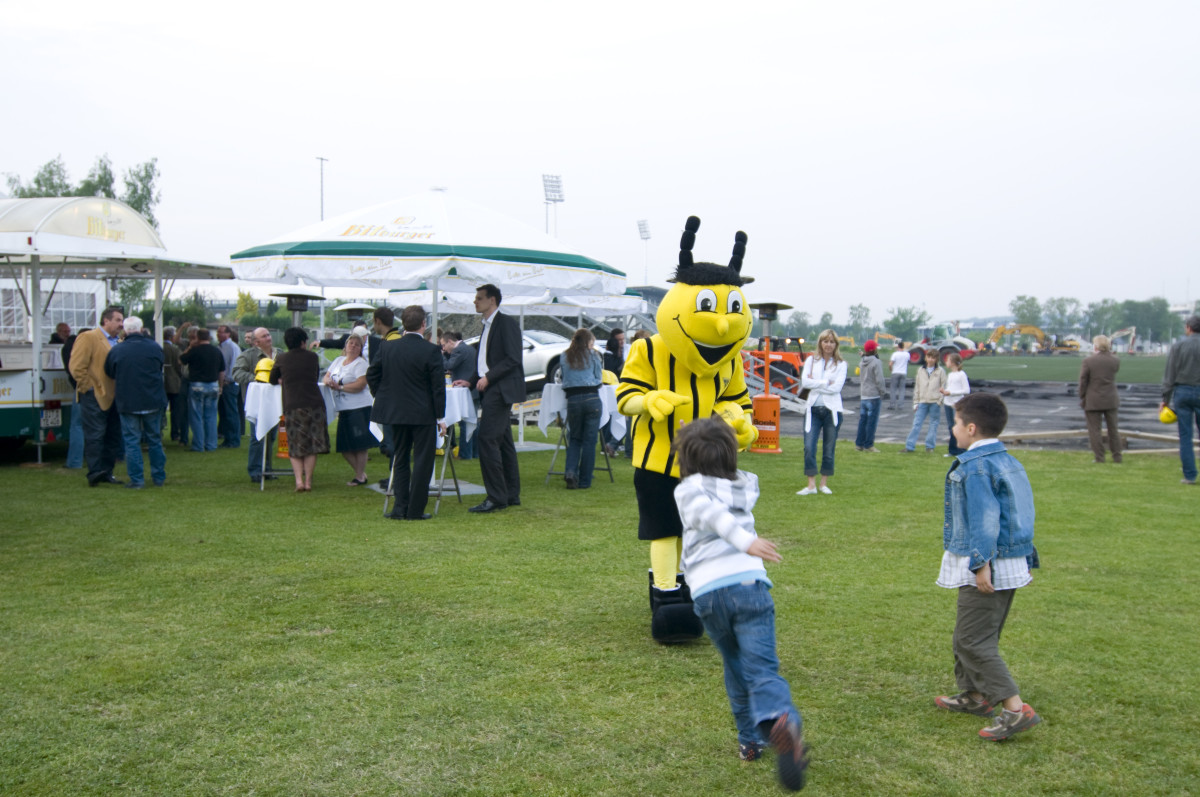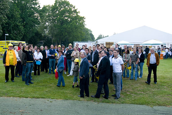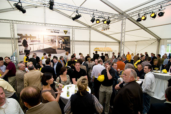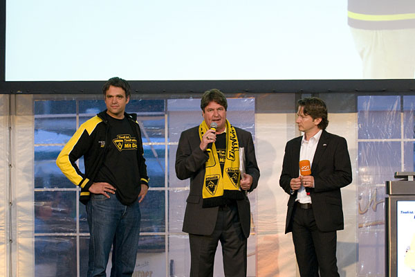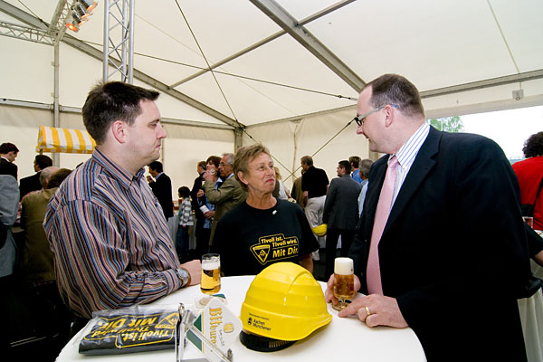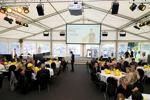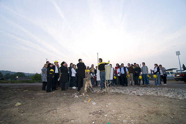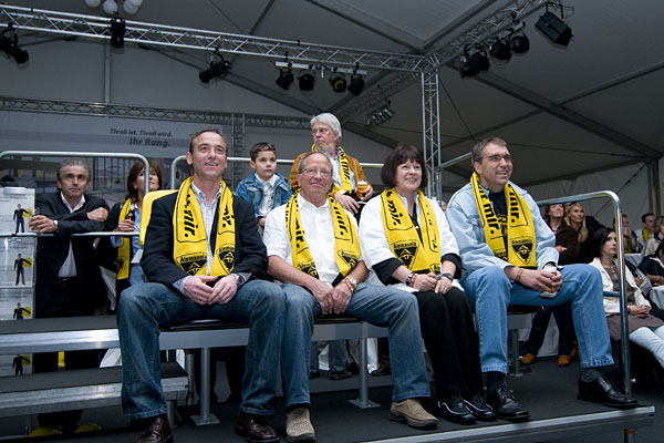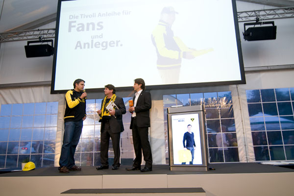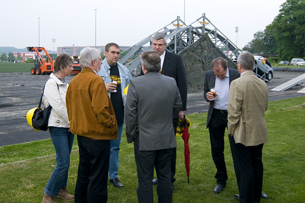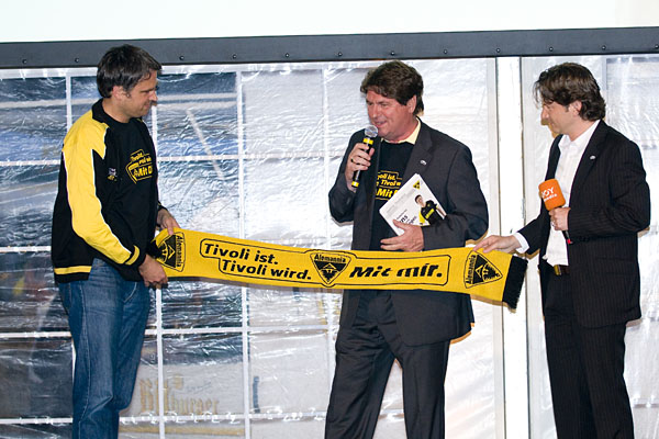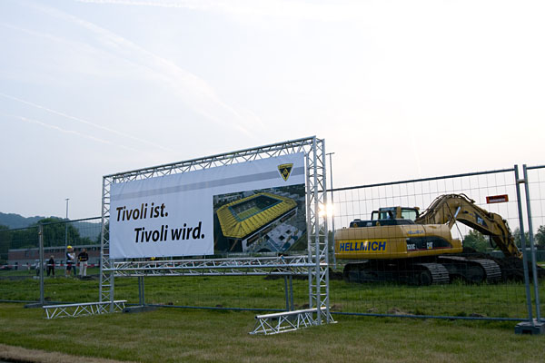 Zahlreiche Gäste waren der Einladung auf „Aachens emotionalste Baustelle“ gefolgt. Naben leckerem Barbecue und Drinks erwartete die Anwesenden interessante Talkrunden mit Moderator Stephan Kaußen rund um das Thema Stadionneubau und die seit gestern erhältliche Tivoli-Anleihe, die Alemannia Aachen ausgibt. Projektleiter für den Stadionbau Stephan van der Kooi, Alemannia Geschäftsführer Frithjof Kraemer, Alemannia-Marketingleiter Thomas Korr oder auch Chef-Trainer Jürgen Seeberger gaben in diesem Rahmen Auskunft über die Planungen. Bevor die Bagger von Hellmich im Anschluss an den Spatenstich mit dem Bau richtig beginnen, konnten die Gäste auf der Baufläche selbst Hand anlegen. Beim Baggerfahren, BobCat-Challenge oder Offroad-Trial war für jeden Gast etwas dabei. Darüber hinaus bot die Alemannia Baustellenführungen an. Van der Kooi leitete die Wissbegierigen über das Areal, auf dem bis Sommer nächsten Jahres der neue Tivoli entsteht. Hier war Phantasie und gutes Vorstellungsvermögen gefragt. Wem dies nicht genügte, der kam am Ende des Events auf seine Kosten. Bei der Premiere des Films über das neue Stadion konnten sich die Gäste ein konkretes Bild von Alemannias neuer Heimat machen und schon mal vom ersten Spiel im neuen Tivoli träumen. Absoluter Renner des Abends war die Tivoli-Anleihe. Die meisten Gäste ließen es sich nicht entgehen, eine der limitierten Schmuckurkunden zu erwerben und damit einen Teil der Tivoli-Zukunft zu sichern.