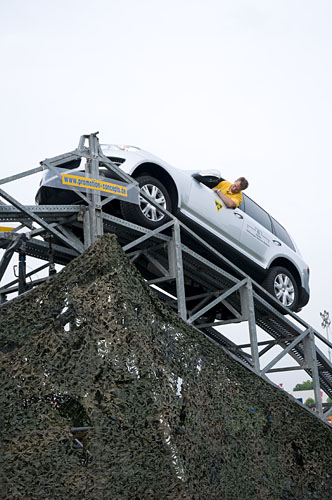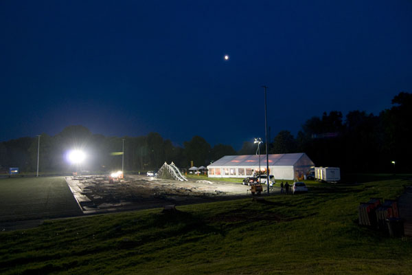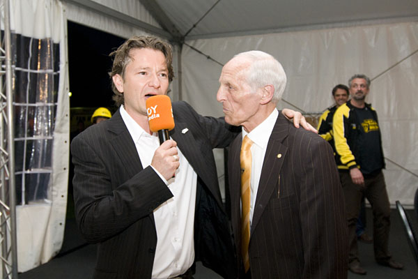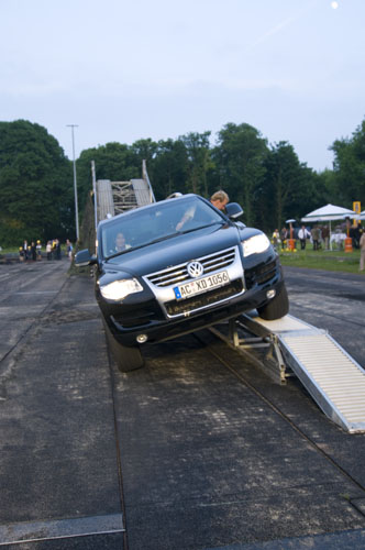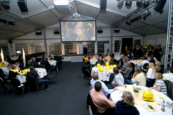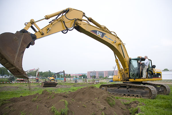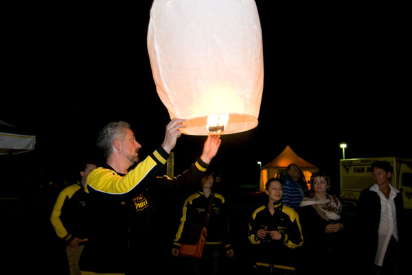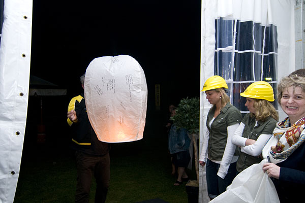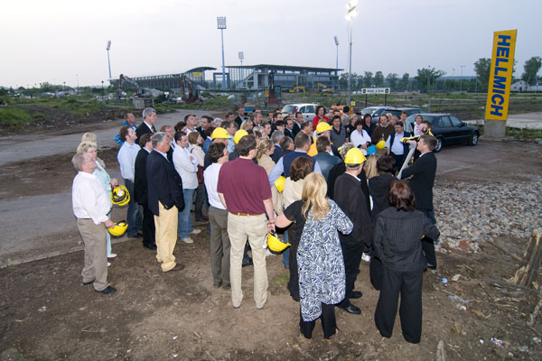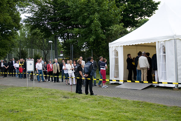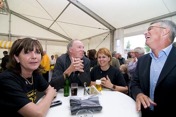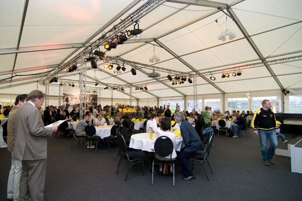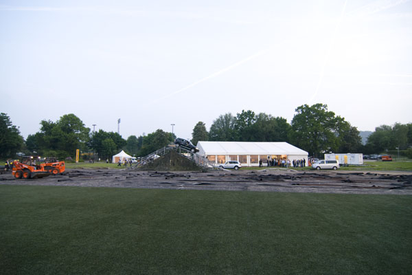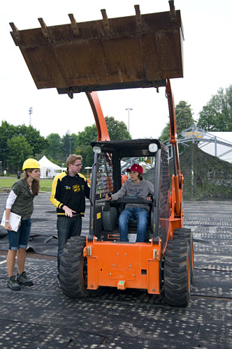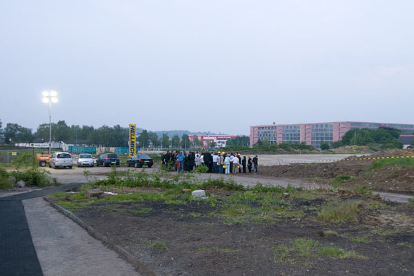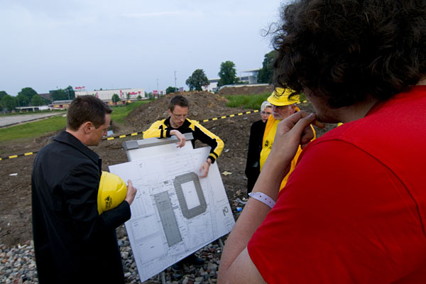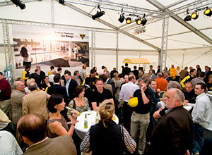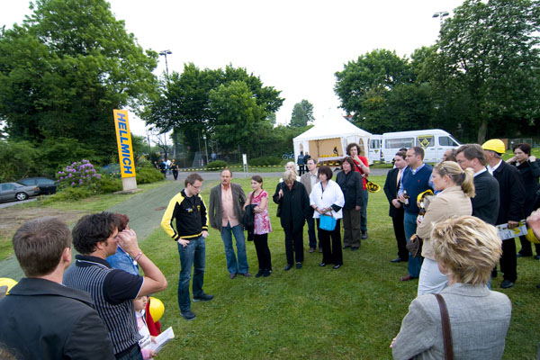 Zahlreiche Gäste waren der Einladung auf „Aachens emotionalste Baustelle“ gefolgt. Naben leckerem Barbecue und Drinks erwartete die Anwesenden interessante Talkrunden mit Moderator Stephan Kaußen rund um das Thema Stadionneubau und die seit gestern erhältliche Tivoli-Anleihe, die Alemannia Aachen ausgibt. Projektleiter für den Stadionbau Stephan van der Kooi, Alemannia Geschäftsführer Frithjof Kraemer, Alemannia-Marketingleiter Thomas Korr oder auch Chef-Trainer Jürgen Seeberger gaben in diesem Rahmen Auskunft über die Planungen. Bevor die Bagger von Hellmich im Anschluss an den Spatenstich mit dem Bau richtig beginnen, konnten die Gäste auf der Baufläche selbst Hand anlegen. Beim Baggerfahren, BobCat-Challenge oder Offroad-Trial war für jeden Gast etwas dabei. Darüber hinaus bot die Alemannia Baustellenführungen an. Van der Kooi leitete die Wissbegierigen über das Areal, auf dem bis Sommer nächsten Jahres der neue Tivoli entsteht. Hier war Phantasie und gutes Vorstellungsvermögen gefragt. Wem dies nicht genügte, der kam am Ende des Events auf seine Kosten. Bei der Premiere des Films über das neue Stadion konnten sich die Gäste ein konkretes Bild von Alemannias neuer Heimat machen und schon mal vom ersten Spiel im neuen Tivoli träumen. Absoluter Renner des Abends war die Tivoli-Anleihe. Die meisten Gäste ließen es sich nicht entgehen, eine der limitierten Schmuckurkunden zu erwerben und damit einen Teil der Tivoli-Zukunft zu sichern.