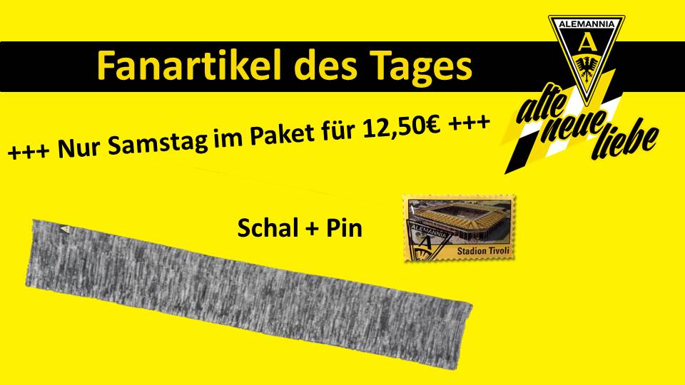 Zum Heimspiel gegen die U21 des 1. FC Köln bietet die Alemannia ein Paket, bestehend aus einen grauen Fanschal und einem Pin, zum Angebotspreis von nur 12,50 Euro an.