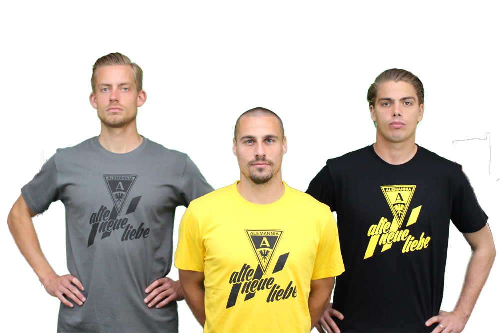 Zum Heimspiel gegen Rot-Weiss Essen bietet die Alemannia das T-Shirt „Alte Neue Liebe“ in den Farben gelb, grau und schwarz an.