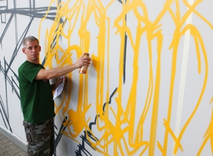 Vor rund einem Jahr wurde in der Arbeitsgruppe Stadionbau, die sich aus Alemannia-Verantwortlichen und Fans zusammensetzt, die Idee geboren, die grauen Flächen im Stadionrund zu verschönern. „Die Grundidee ist von der Stadiongruppe ausgegangen. Wir haben uns überlegt, einige Flächen im Stadion von den Fangruppen gestalten zu lassen“, erläutert der Sprecher der Arbeitsgruppe Boris Gillessen. Der Vorschlag fand schnell Anklang bei den Alemannia Supporters, die sich kurzerhand dazu entschieden, gemeinsam mit einem Graffiti-Künstler Vorschläge zu erarbeiten und diese der Arbeitsgruppe vorzustellen. „Wir wollten uns da, wo wir stehen, auch präsentieren. Also haben wir einige Entwürfe gemacht, sie der Arbeitsgruppe eingereicht und schließlich über die besten Entwürfe, die auch in der Arbeitsgruppe Zuspruch gefunden hatten, intern online über unsere Website abgestimmt“, so Gillessen, der neben seiner Tätigkeit in der Arbeitsgruppe auch Mitglied des 60-Mann starken Fanklubs ist. Mit „da, wo wir stehen“, ist der Block O6 auf der AachenMünchner Tribüne gemeint. Hier sind die Alemannia Supporters am Spieltag zu finden. Ab dem nächsten Heimspiel ein unübersehbarer Platz. Schließlich ziert ein riesiges Graffiti mit dem Schriftzug des Fanklubs, eingerahmt durch die Stehplatztribüne des alten Tivoli und einen Flutlichtmast von Alemannias alter Spielstätte die einst graue Wand zwischen den Treppenaufgängen. „Da die Supporters ja eher der ältere Jahrgang sind, wollten sie die Verbindung zu den Ursprüngen aufgreifen“, sagt Lars Kesseler, der das Kunstwerk am Tivoli sprayt. Zwei Tage dauert es, das Bild zu vollenden. „Auch wenn ich kein ausgemachter Fußballfan bin, ist es schon etwas ganz Besonderes, gerade im Tivoli zu sprayen. Zumal es das erste Graffiti im Stadion ist“, so der Diplom Designer Kessler, der bereits seit 22 Jahren Graffitis sprüht.