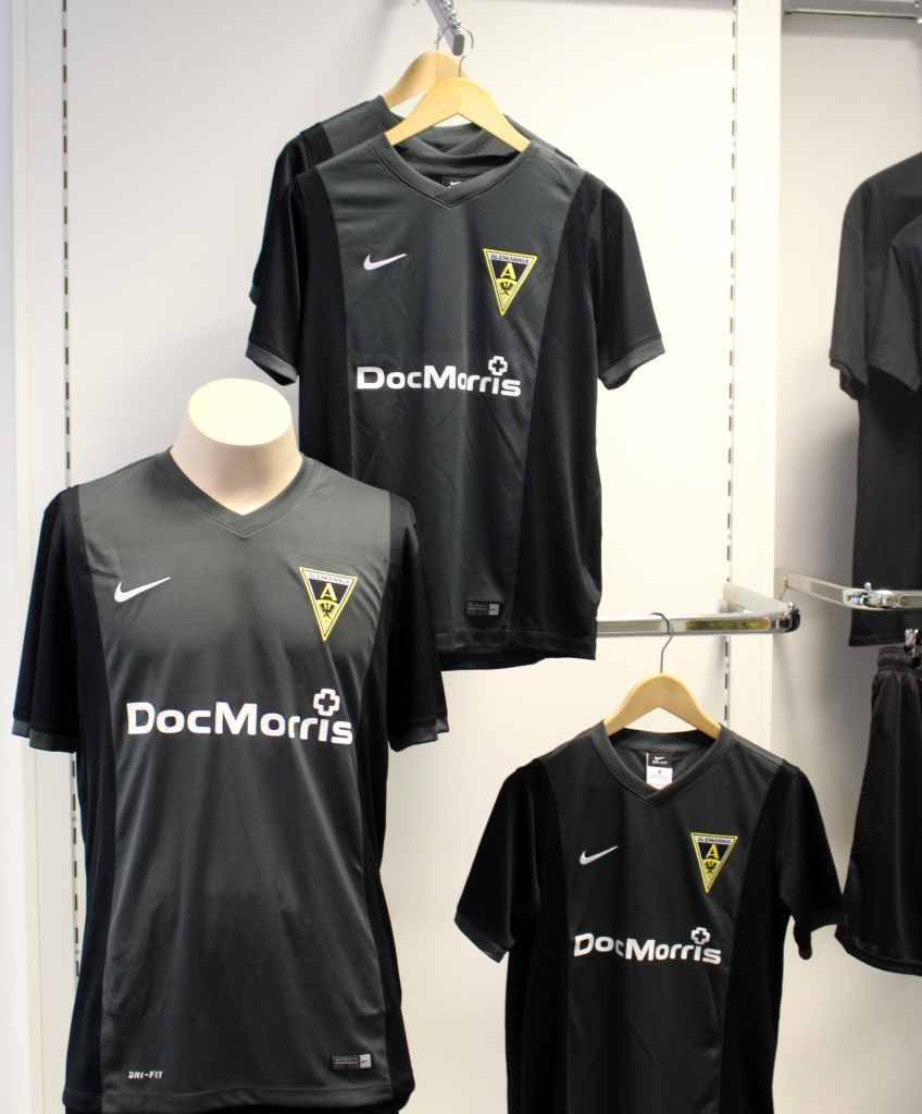 Das neue Heimdress der Alemannia-Kicker für die Saison 2014/15 ist eingetroffen. Das in den Farben schwarz und grau gehaltene Shirt gibt es ab sofort im Shop am Tivoli zum Preis von 54,99 Euro für Erwachsene und 49,99 Euro für Kinder.