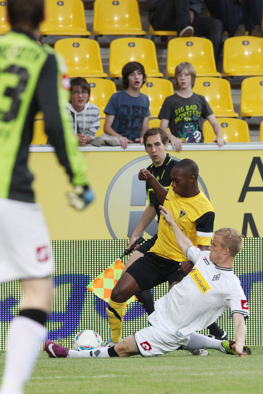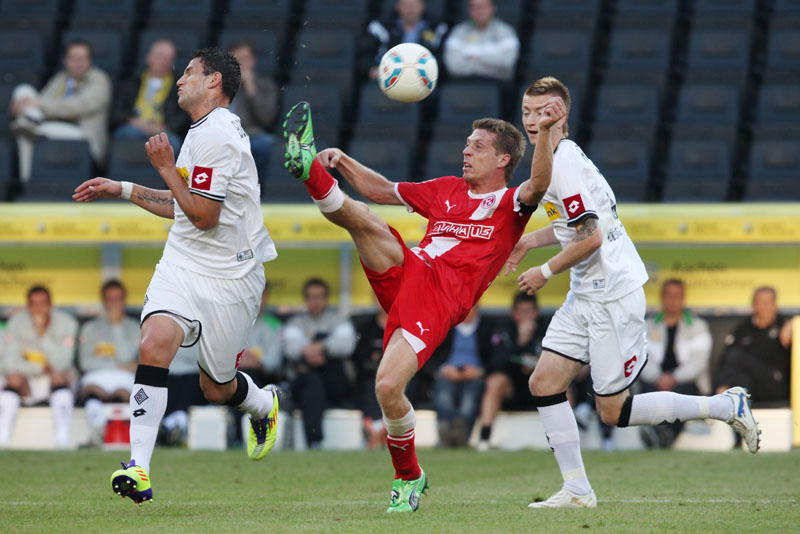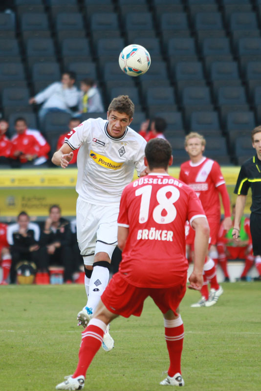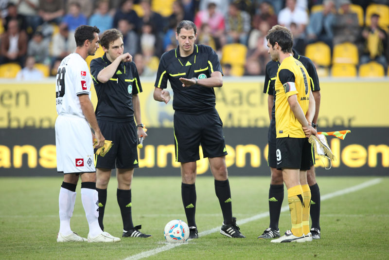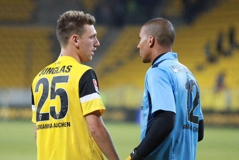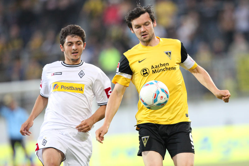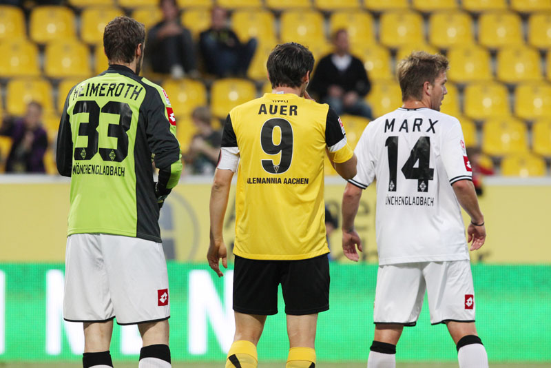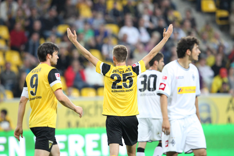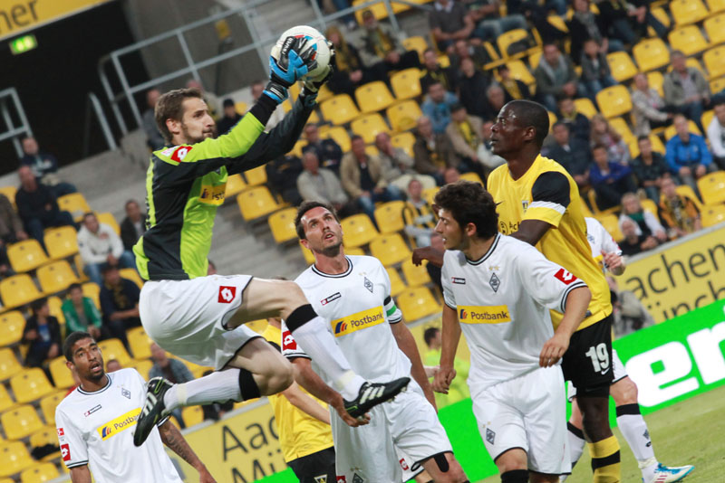 Die Hyballa-Elf setzte die Fohlen mächtig unter Druck, um jeden Ball wurde aufopferungsvoll gefightet. Nach einer wunderschönen Kombination von Stiepermann und Uludag rutschte Auer einen Schritt an der Hereingabe von Stiepermann vorbei. Gladbachs Marx sorgte zwischenzeitlich für einen echten Hammer aus der Distanz, doch die tonangebende Mannschaft war weiterhin die Alemannia. Uludag, Radjabali-Fardi und Stiepermann harmonierten wunderbar auf links, eine Hereingabe setzte Yabo aus kurzer Distanz an die Latte und auch den Nachschuss von Junglas klärte Wendt gerade noch per Kopf auf der Linie (30.).