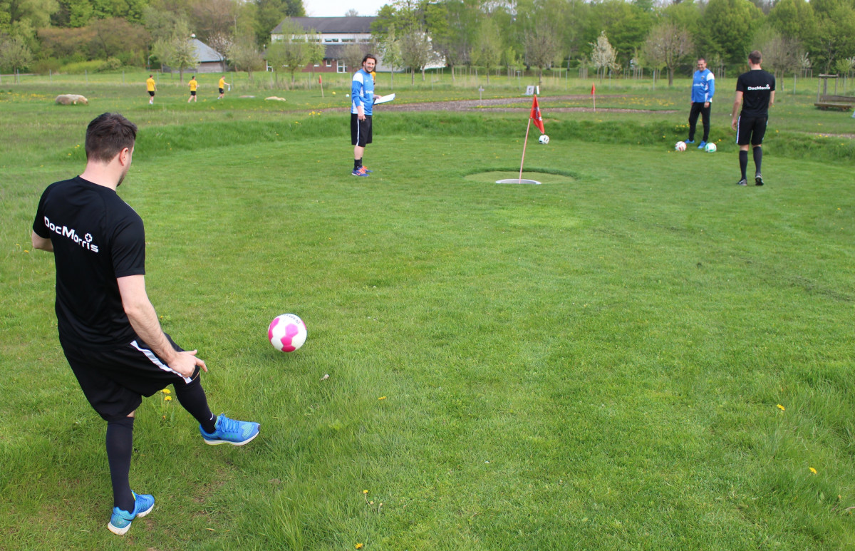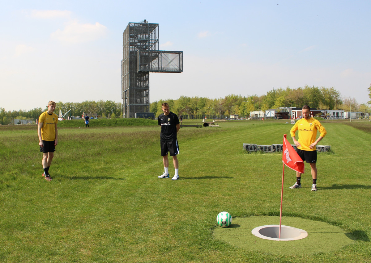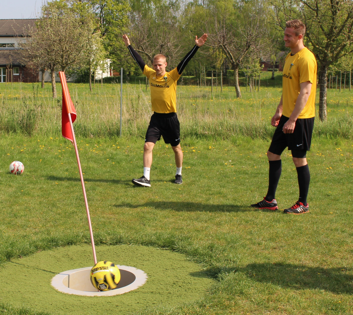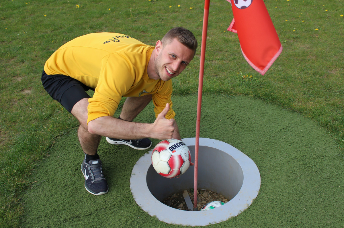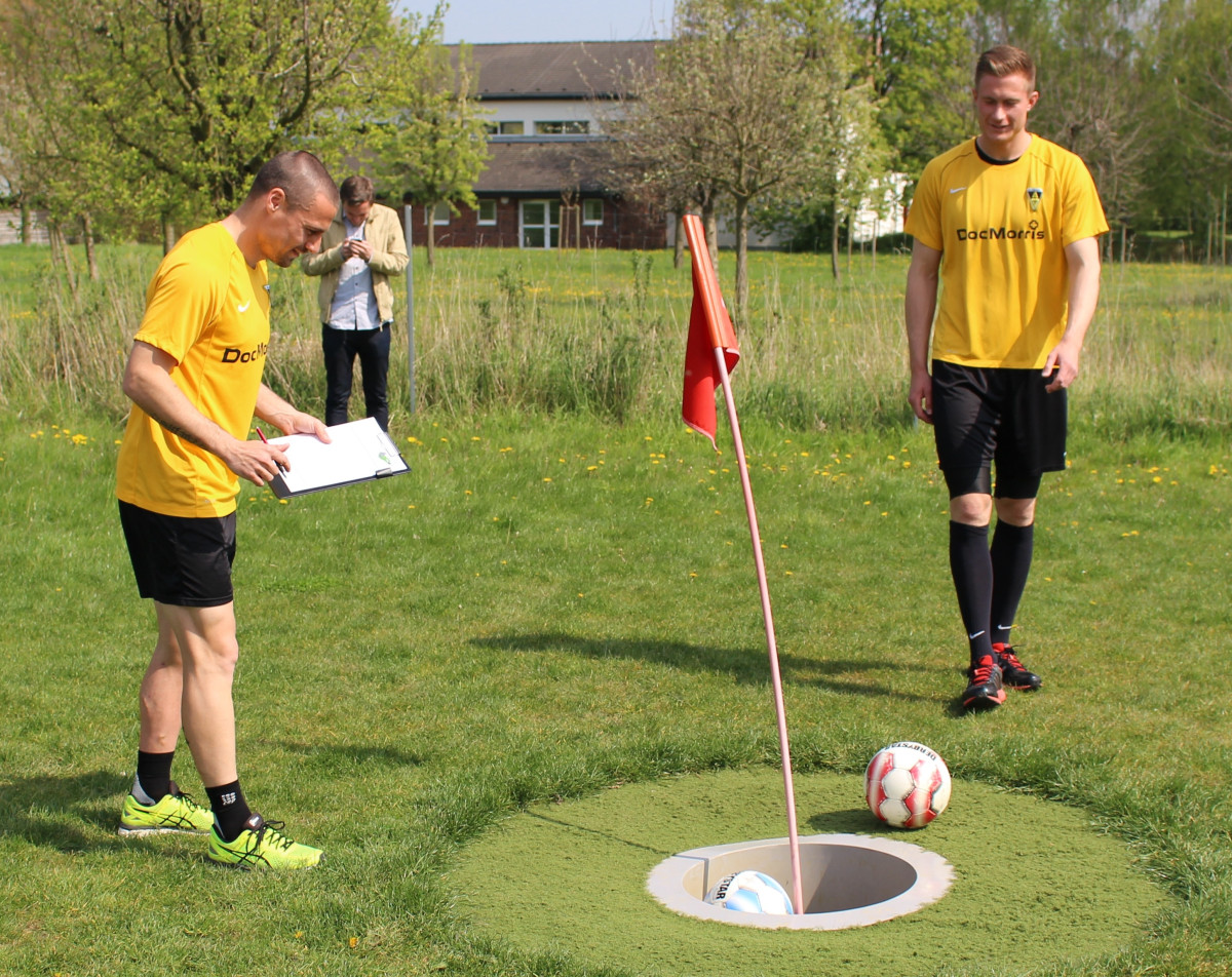Beim Fußballgolf gilt es, einen Fußball mit möglichst wenigen Schüssen in ein Loch zu spielen. Ein Unterschied zum Golf: man benötigt keinen Schläger, die Bälle werden mit dem Fuß geschossen.