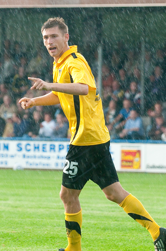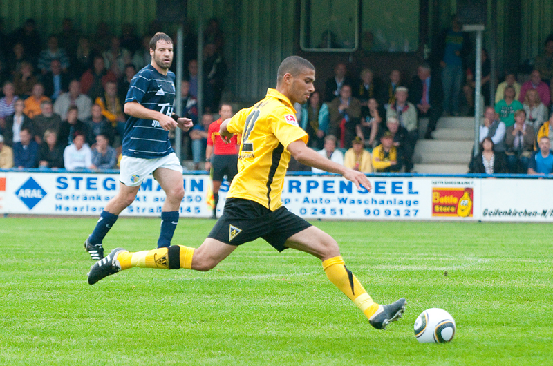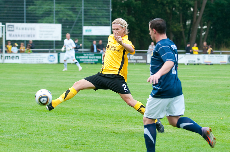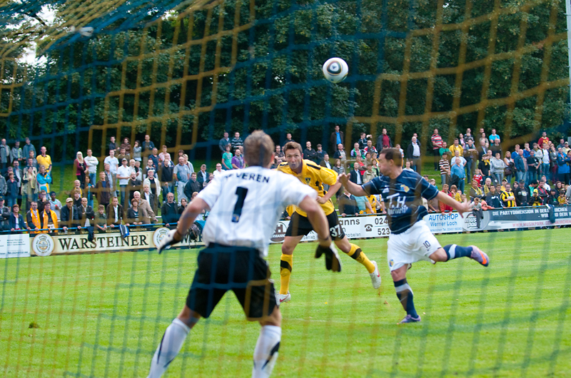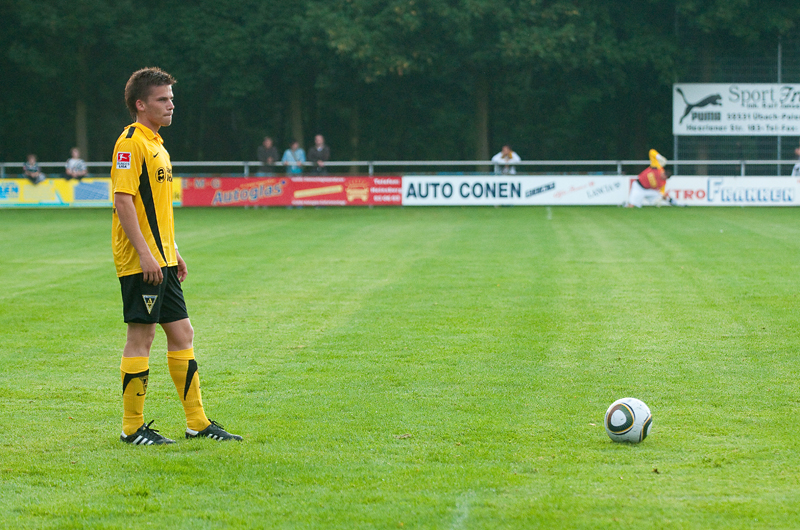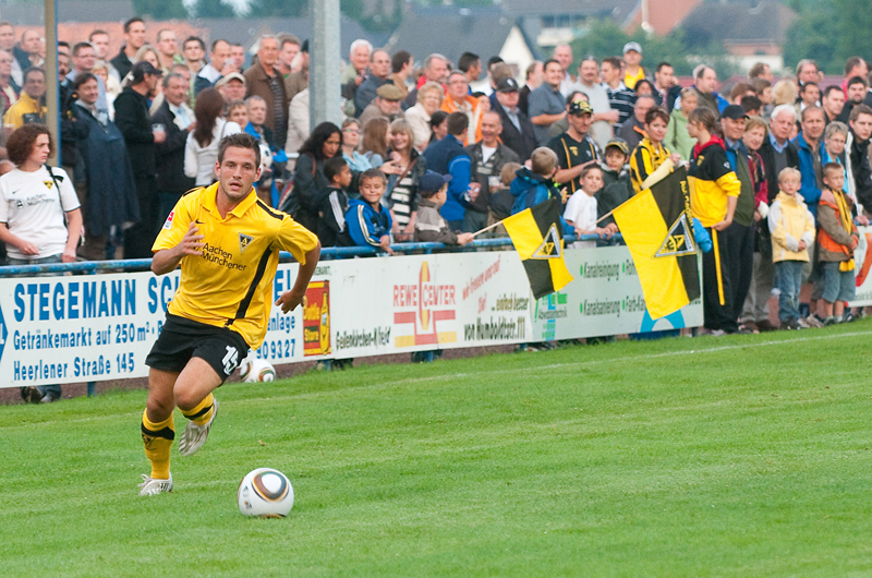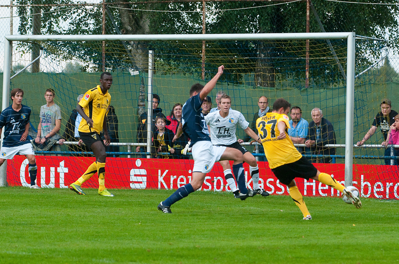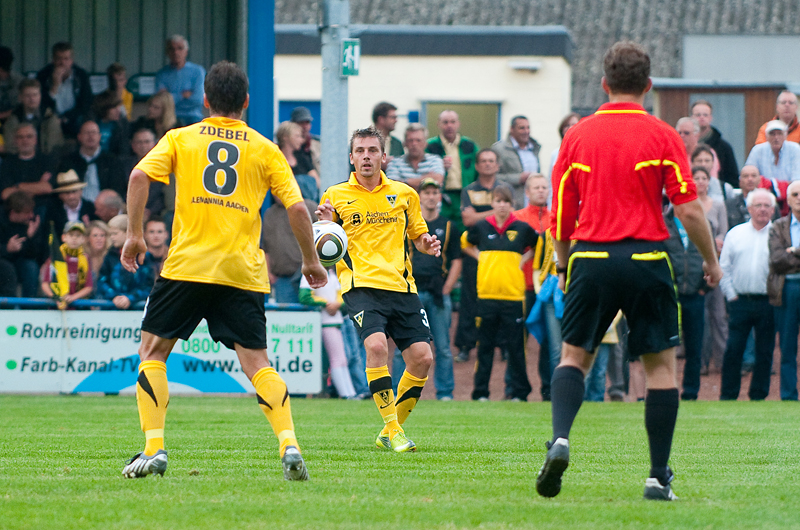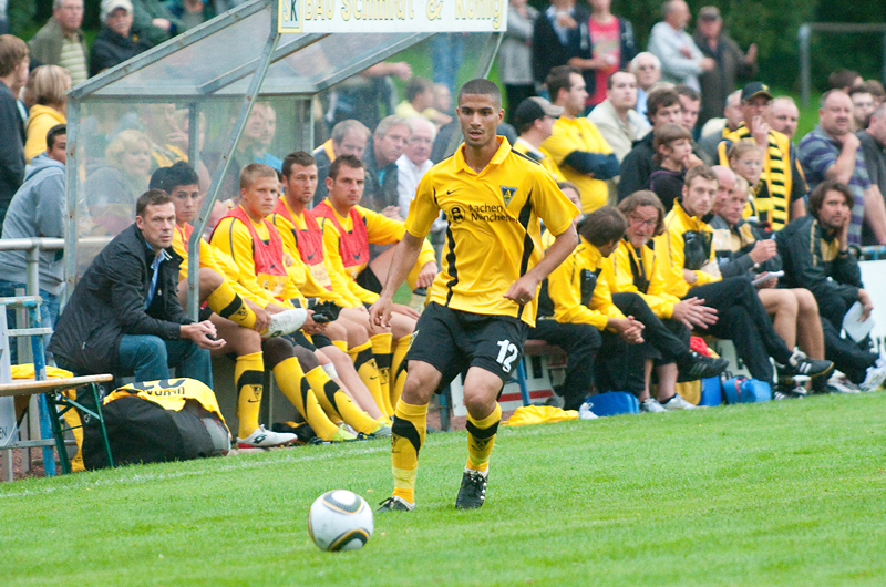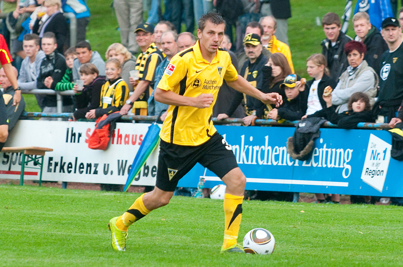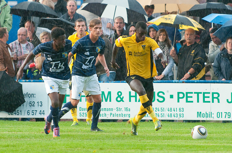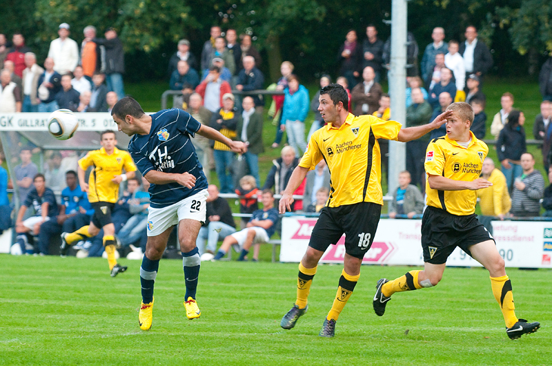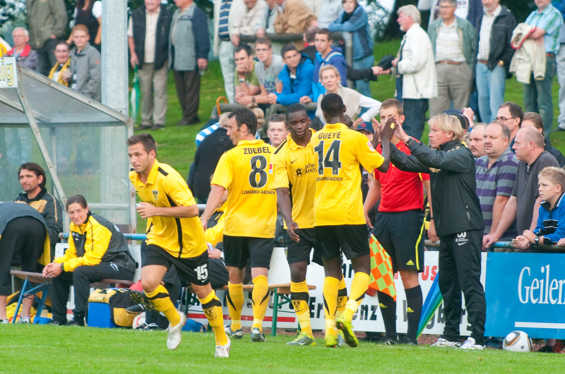 Danach boten sich den Gastgebern gegen weit aufgerückte Aachener zwei gute Kontergelegenheiten. Herzig und Feisthammel bereinigten jeweils in letzter Sekunde die Situation. Auf der anderen Seite spielten die Schwarz-Gelben einen sehenswerten Treffer heraus: Achenbach zirkelte die Kugel auf den Kopf von Gueye, der mit einem schulmäßigen Kopfstoß die Führung besorgte (12.). Zwei weitere gute Möglichkeiten boten sich Gueye, der am Mittwoch die Kapitänsbinde trug. Schnorrenberg parierte stark.
