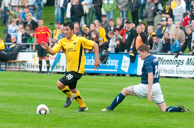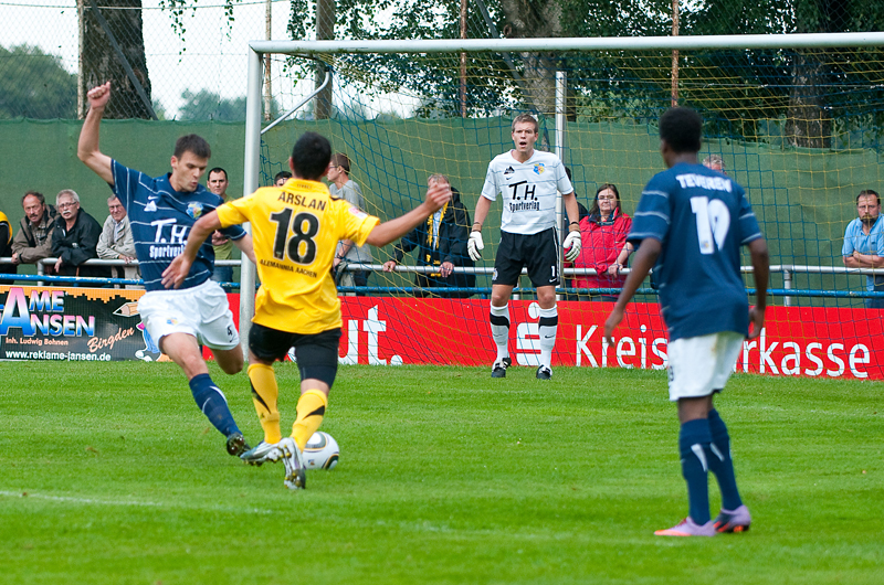 Von den Teverener Kontergelegenheiten der Anfangsphase war nichts mehr zu sehen, obwohl die Alemannia weiterhin extrem hoch stand. Bereits unmittelbar hinter der Mittellinie war die Viererkette postiert. Das rächte sich bei einem Ballverlust von Zdebel, als Simons mutterseelenallein auf dem Weg zum Ausgleich war. Sein schwacher Schuss landete aber in den Armen von Hohs. Auf der anderen Seite bereitete Achenbach sein zweites Tor vor. Gueye rutschte der Ball noch unter dem Fuß durch, doch Höger vollstreckte aus kurzer Distanz (38.). Sekunden später hatte Junglas das 3:0 auf dem Fuß, scheiterte aber am heraus stürzenden Germania-Keeper. Der hatte kurz darauf keine Chance, als er von Arslan genarrt wurde. Der Spielmacher setzte ihn mit einem Hackentrick Schachmatt, Junglas musste nur noch ins leere Tor schieben (42.). 60 Sekunden später stand Gueye erneut wunderbar in der Luft und köpfte eine Stieber-Flanke zum 4:0 ein (43.).