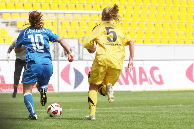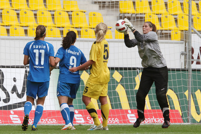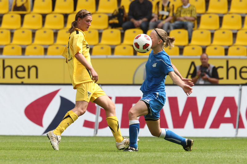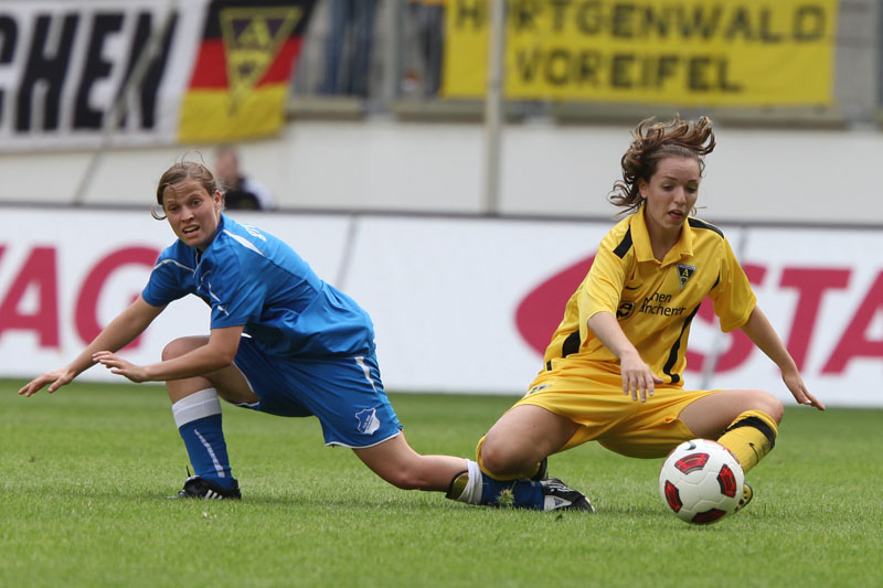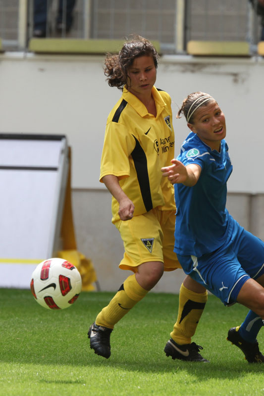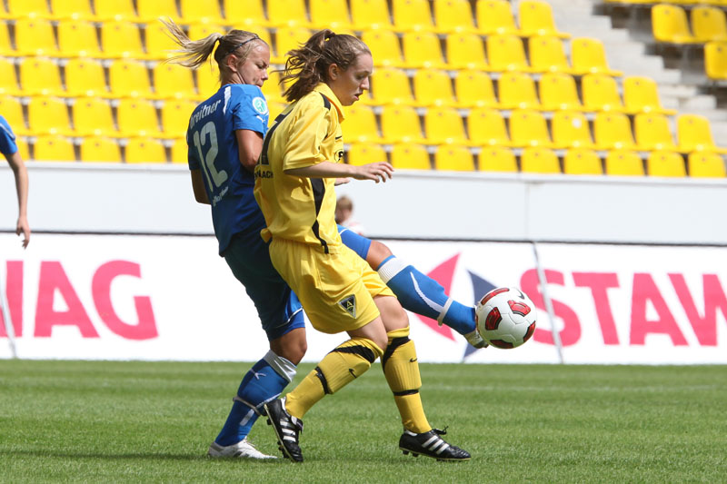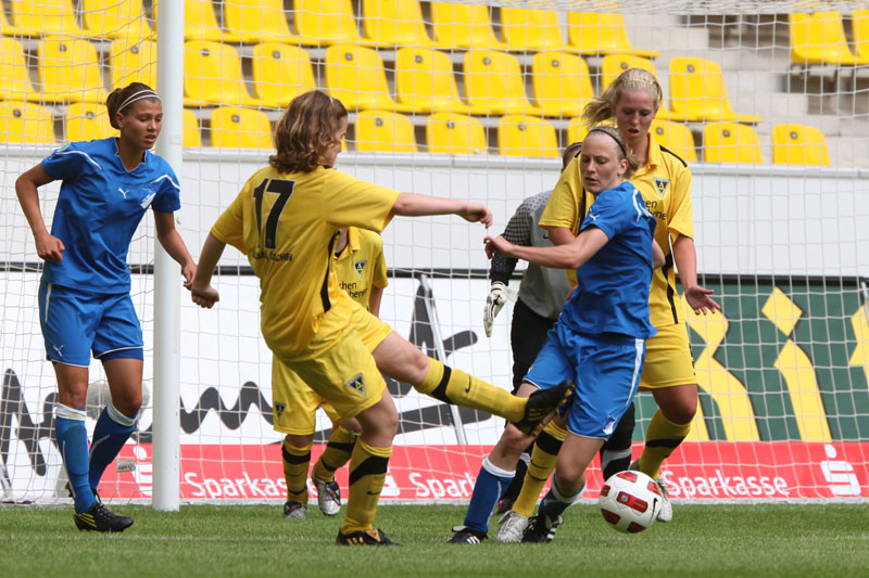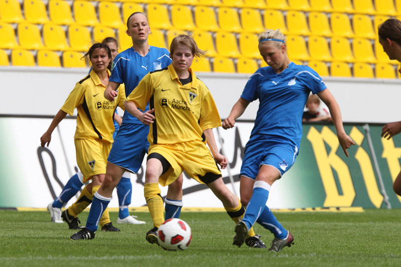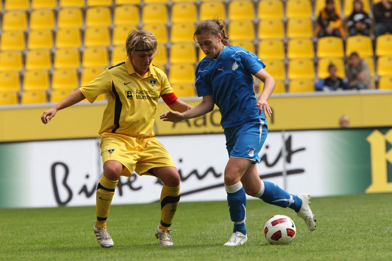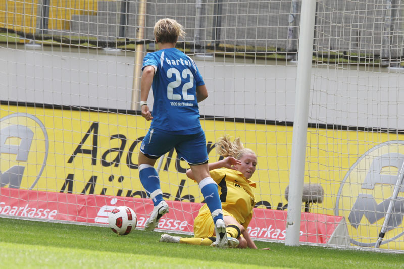 Vor immerhin einigen hundert Zuschauern, die zum Auftakt des langen Fußballnachmittags bereits um 13 Uhr den Tivoli bevölkerten, erlebte das Team von Manuel Ortiz eine unglückliche Anfangsphase. In der 4. Minute ließ Torfrau Julia Hahn eine Flanke fallen. Christine Schneider sagte Danke und staubte zur Hoffenheimer Führung ab. Auch die zweite Gelegenheit ließen sich die Kraichgauerinnen nicht entgehen. Susanne Hartel ging auf und davon, umspielte zuerst die Torfrau und dann auch noch eine heraneilende Verteidigerin und schob zum 0:2 ein. Die Schwarz-Gelben waren bis dahin überhaupt noch nicht im Spiel und wirkten etwas verunsichert.