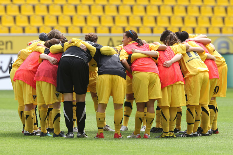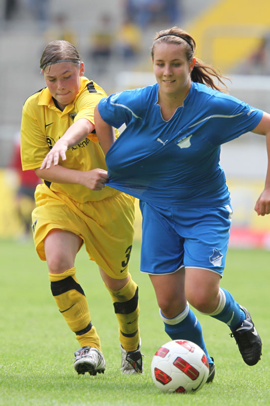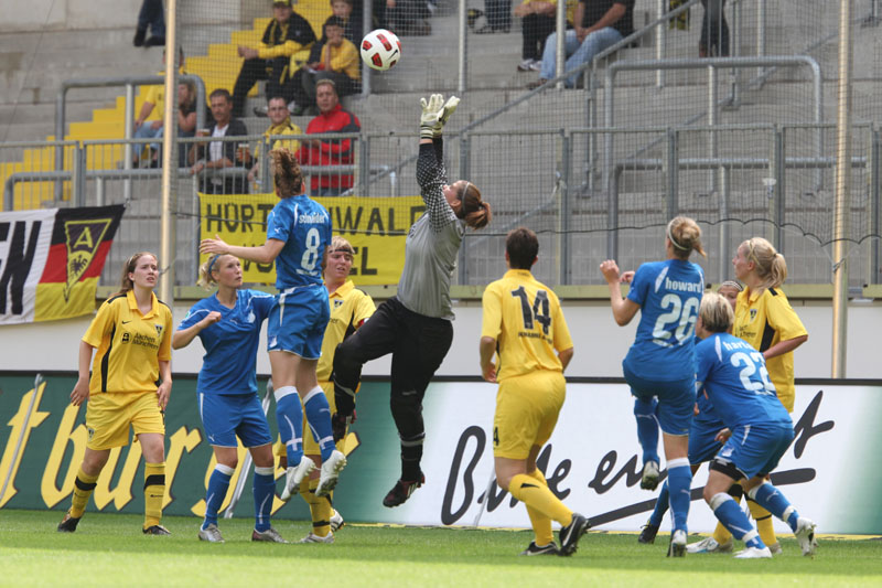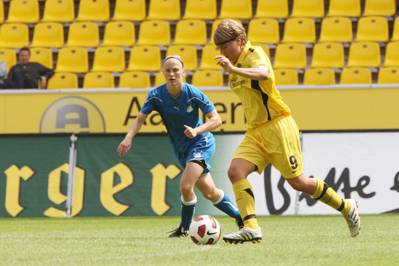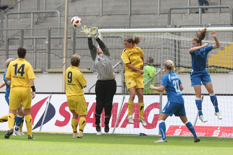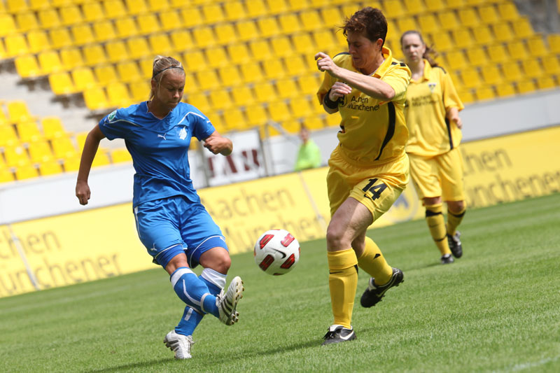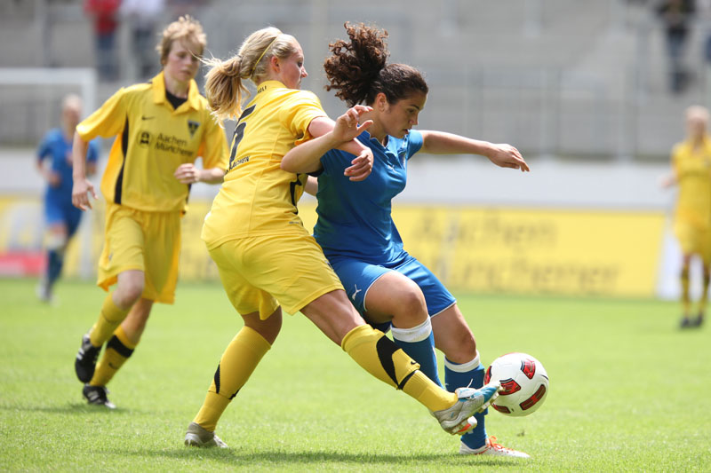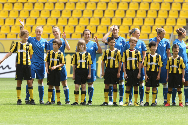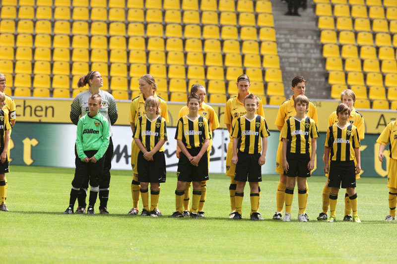 Vor immerhin einigen hundert Zuschauern, die zum Auftakt des langen Fußballnachmittags bereits um 13 Uhr den Tivoli bevölkerten, erlebte das Team von Manuel Ortiz eine unglückliche Anfangsphase. In der 4. Minute ließ Torfrau Julia Hahn eine Flanke fallen. Christine Schneider sagte Danke und staubte zur Hoffenheimer Führung ab. Auch die zweite Gelegenheit ließen sich die Kraichgauerinnen nicht entgehen. Susanne Hartel ging auf und davon, umspielte zuerst die Torfrau und dann auch noch eine heraneilende Verteidigerin und schob zum 0:2 ein. Die Schwarz-Gelben waren bis dahin überhaupt noch nicht im Spiel und wirkten etwas verunsichert.