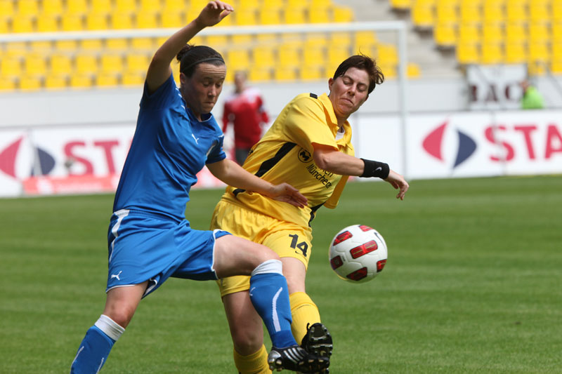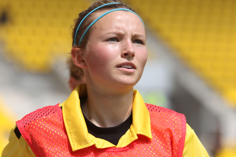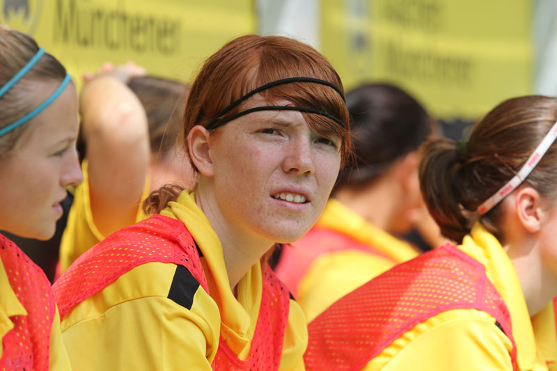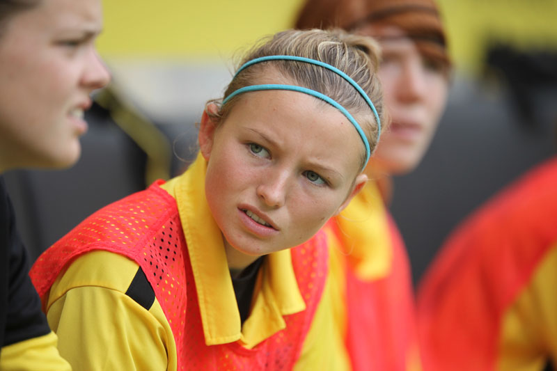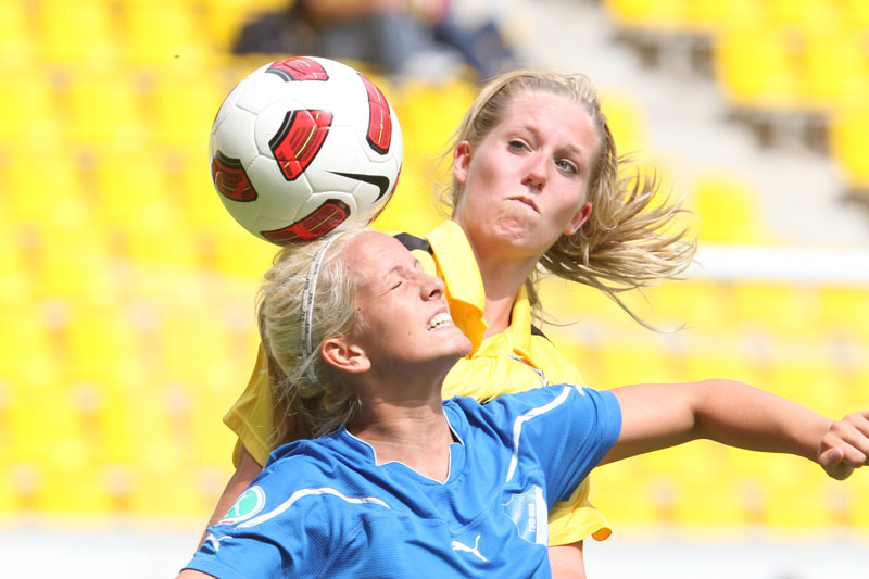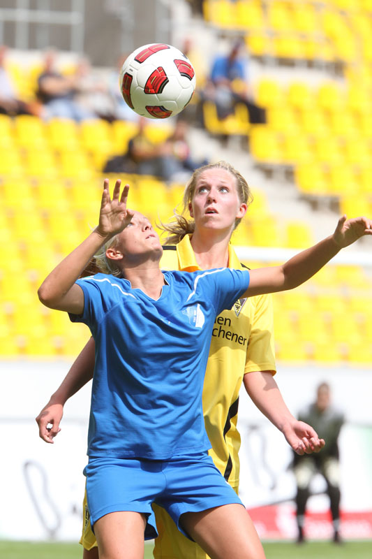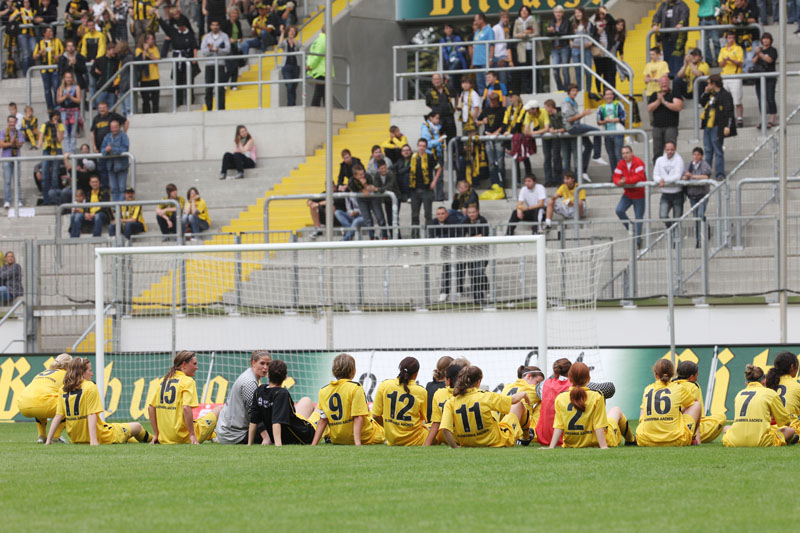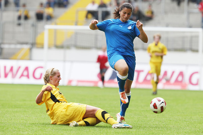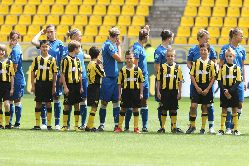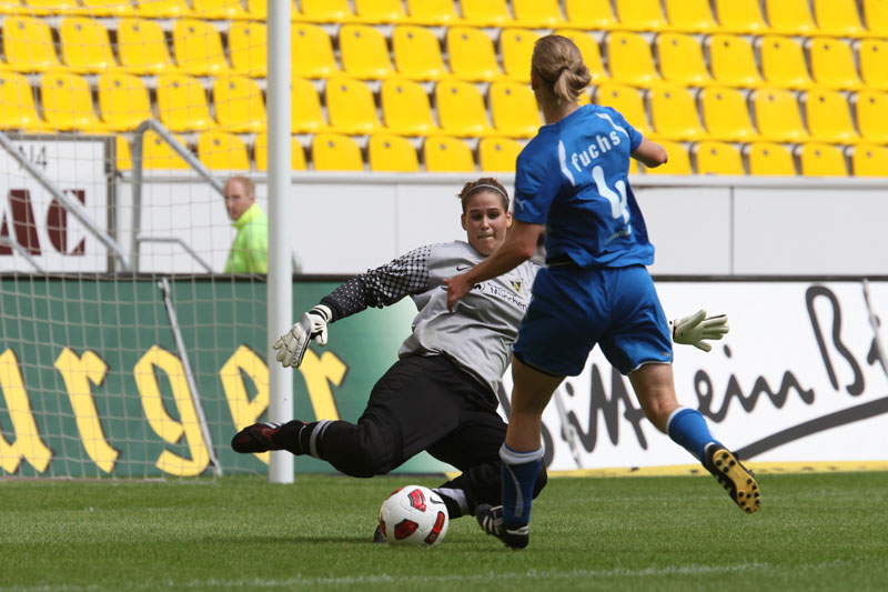 Vor immerhin einigen hundert Zuschauern, die zum Auftakt des langen Fußballnachmittags bereits um 13 Uhr den Tivoli bevölkerten, erlebte das Team von Manuel Ortiz eine unglückliche Anfangsphase. In der 4. Minute ließ Torfrau Julia Hahn eine Flanke fallen. Christine Schneider sagte Danke und staubte zur Hoffenheimer Führung ab. Auch die zweite Gelegenheit ließen sich die Kraichgauerinnen nicht entgehen. Susanne Hartel ging auf und davon, umspielte zuerst die Torfrau und dann auch noch eine heraneilende Verteidigerin und schob zum 0:2 ein. Die Schwarz-Gelben waren bis dahin überhaupt noch nicht im Spiel und wirkten etwas verunsichert.
