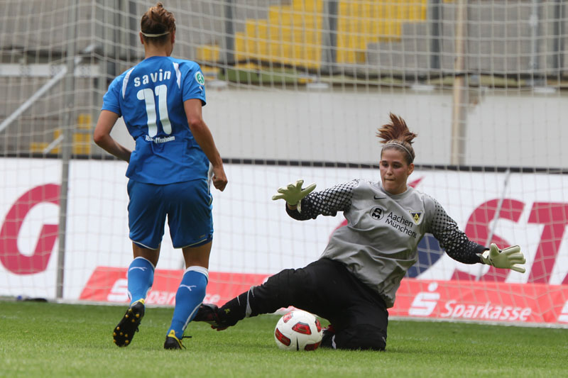 Kurz nach Wiederbeginn brachte Coach Manuel Ortiz dann Laura Jünger für Sandra Joder (48.). Beinahe wäre Treffer Nummer 5 für die Gäste gefallen, aber Chantal Fuchs traf mit einem Lob über Hahn hinweg nur die Latte. In der Phase nach der Pause bewahrte Julia Hahn ihr Team mit einigen starken Paraden vor einem höheren Rückstand – die Torfrau hatte sich von ihrem Fehler in der Anfangsphase erholt und war nun beste Aachenerin. Gegen weit aufgerückte Schwarz-Gelbe hatte Hoffenheim zahlreiche Kontermöglichkeiten, die aber teils kläglich ausgelassen wurden. Bis Christine Schneider zum vierten Mal zur Tat schritt und die x-te Chance nutzte – 0:5 in der 73. Minute. Sabrina Bemmelen hatte eine gute Schusschance für Aachen, verzog jedoch um gut einen Meter. Die beste Chance für Schwarz-Gelb bot sich Ilona Sieben, die aus vier Metern Entfernung den Ball leider nicht voll traf. Zehn Minuten vor Schluss scheiterte Sabine Kuypers an Kristina Kober im TSG-Tor. In der 83. Minute markierte Savin im Nachsetzen das 0:6, nachdem Arief das Leder zunächst von der Torlinie gekratzt hatte, dann aber gegen die nachsetzende Hoffenheimerin keine Chance mehr hatte. Savin legte in der 86. Minute noch einmal nach und traf zum 0:7.