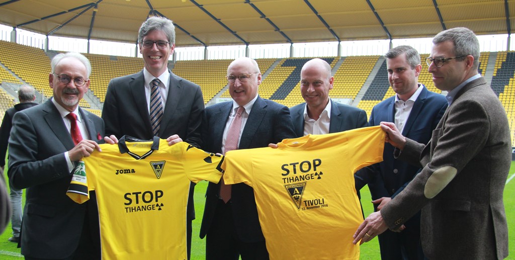 Das nur knapp 60 Kilometer von Aachen entfernt liegende Atomkraftwerk Tihange bereitet den Menschen in der Region große Angst. „Weil wir unser gesellschaftlichen Verantwortung als größter Sportverein der Region bewusst sind, rufen wir zu „Stop Tihange“ auf“, erklärt Alemannias Aufsichtsratsvorsitzender Dr. Christian Steinborn den Grund für diese einmalige Aktion.