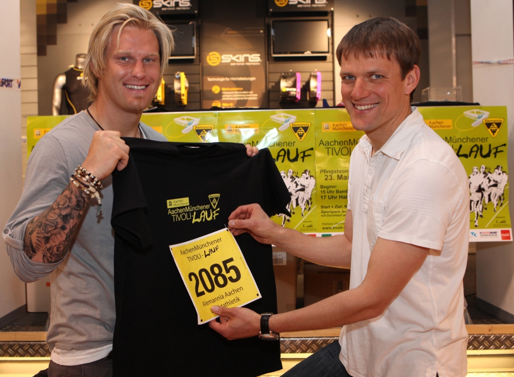 Und nicht nur Leichtathleten werden im Starterfeld geführt. So ist Volleyball-Nationalspielerin Esther Stahl in der 3x7 Kilometer Staffel am Start und auch die Frauen-Fußballer der Schwarz-Gelben stellen drei Staffeln. Einen Tag vor ihrem Urlaub wird auch der gesamte Kader der Profi-Kicker der Alemannia inklusive Sportdirektor Erik Meijer gefordert. Sie schnüren ebenfalls die Laufschuhe und verteilen sich auf alle Disziplinen. Nico Herzig holte sich am Freitag bereits seine Startnummer im Sporthaus drucks ab. Mit der Nummer 2085 geht er gemeinsam mit seinem Kollegen Timo Achenbach, Alemannias Dauerläufer auf dem Fußballfeld, in der Staffel an den Start. „Nach Saisonende steht man natürlich nicht mehr so im Saft, aber ich werde versuchen, gut durch zu kommen. Mit Timo habe ich sicherlich einen guten Partner an der Seite, der was rausholen wird“, sagt der Innenverteidiger. Die Staffel der Kicker wird durch eine Läuferin komplettiert, die aus Bewerbern ausgelost wurde. „Wir lassen die Dame dann am Schluss laufen, damit sie sich im Stadion feiern lassen kann. Denn auch wenn wir gegen die Leichtathletik-Profis sicherlich alt aussehen, wollen wir nicht als Letzte ins Ziel kommen“, ergänzt Herzig schmunzelnd.