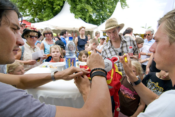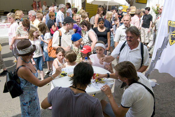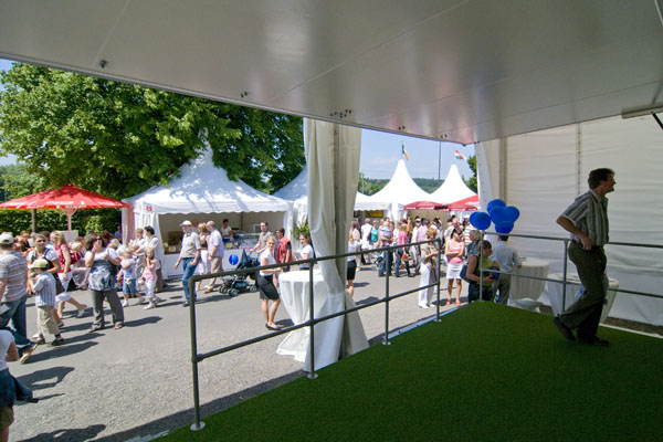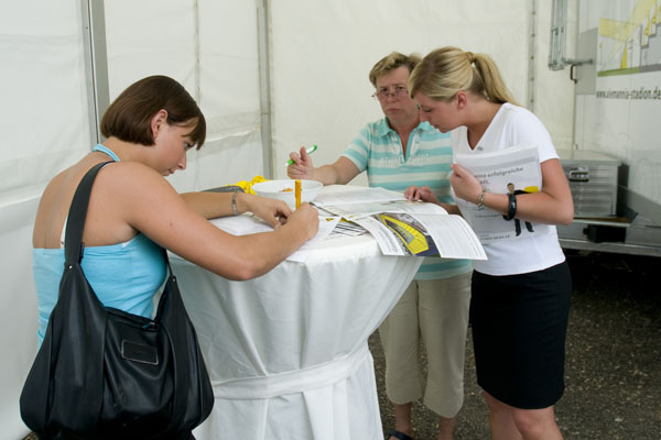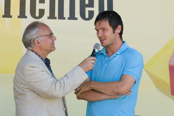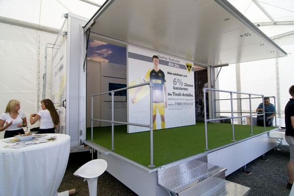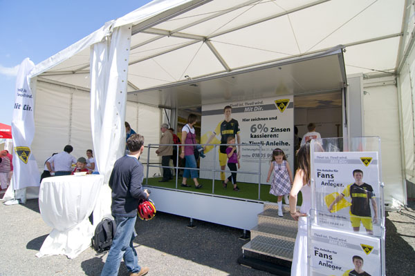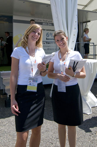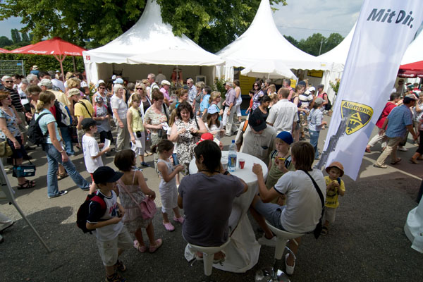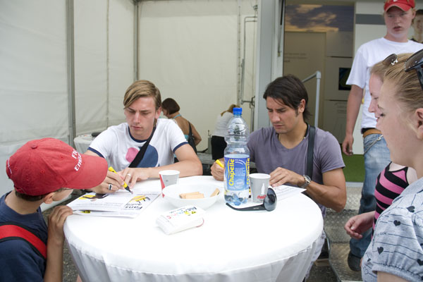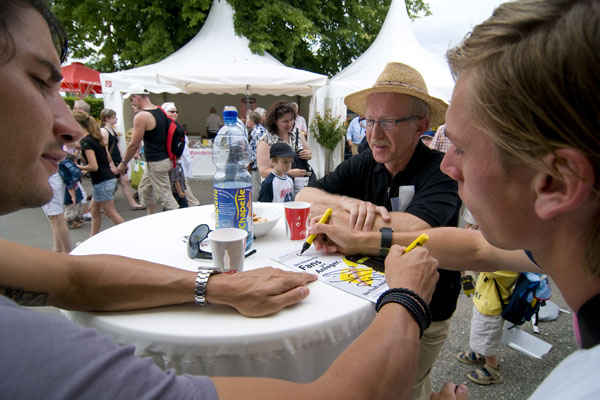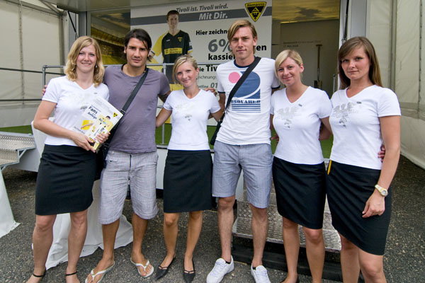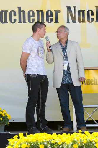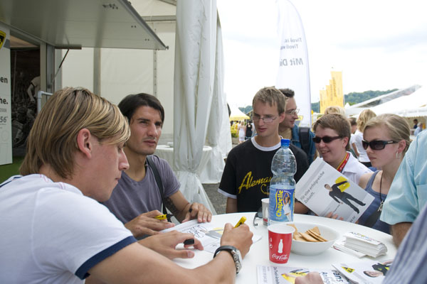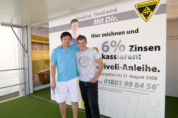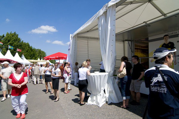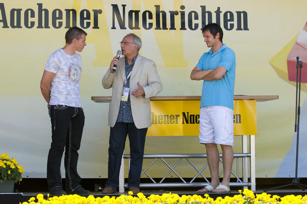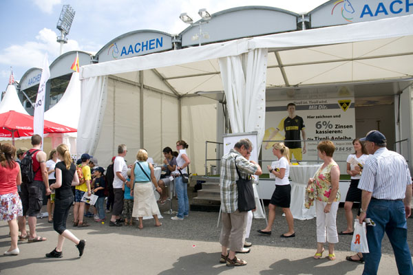 Hier informiert Alemannia Aachen die CHIO-Besucher über den geplanten Stadionneubau sowie die Tivoli-Anleihe. Das Interesse ist groß, täglich werden Anleihe-Formulare ausgefüllt. Und wen es nur um ein Autogramm geht –die Alemannia-Profis sind gefragt. Auch vom Medienpartner Aachener Nachrichten, dessen Bühne im Soerser Winkel nur einen Steinwurf entfernt steht. Moderator Achim Kaiser lässt es sich nicht nehmen, die Alemannen zu befragen. So musste Cristian Fiel als Spanier natürlich seine Meinung zum neuen Europameister abgeben: „Sie waren die beste Mannschaft, und ich wäre enttäuscht gewesen, wenn sie es nicht geschafft hätten. Wenn man die Spanier spielen lässt, dann sind sie kaum zu schlagen“, so „Fielo“.