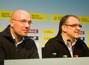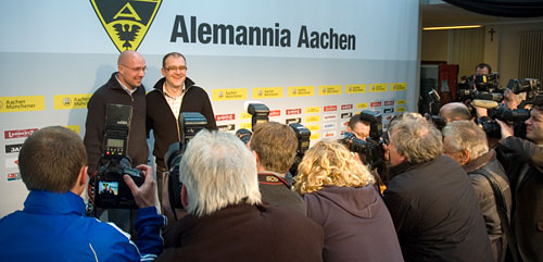 Der Presseraum der Alemannia war prall gefüllt, als Jürgen Seeberger am Montag um 12.30 Uhr offiziell als neuer Chefcoach vorgestellt wurde. Keiner der anwesenden Medienvertreter wollte den ersten Auftritt des in Deutschland bisher weitestgehend unbekannten Trainers verpassen, der sich einem Blitzlichtgewitter ausgesetzt sah. Neben Seeberger standen auch Sportdirektor Jörg Schmadtke, Geschäftsführer Frithjof Kraemer und der Aufsichtsratvorsitzende Dr. Jürgen Linden als Gesprächspartner bereit.