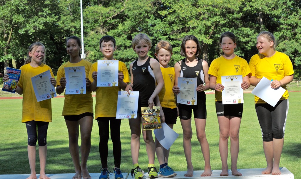 An die 140 Kinder freuten sich beim diesjährigen Kindersportfest der Alemannia-Leichtathleten über wunderbar sonniges Wetter und einen gelungenen Wettkampftag.