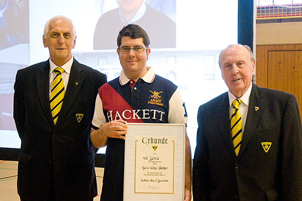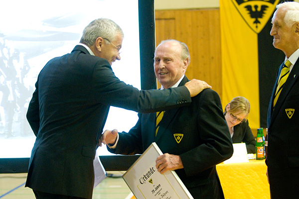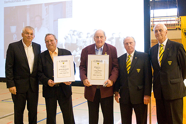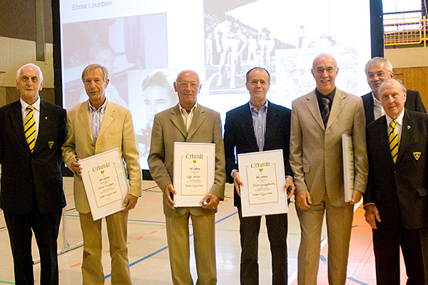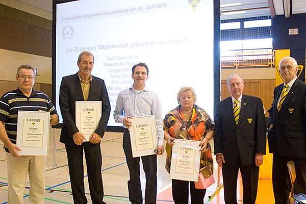 Zu Beginn der Veranstaltung gedachten die Anwesenden zunächst der verstorbenen Mitglieder. Anschließend beglückwünschte Ehrenpräsident Leo Führen die Jubilare. Für 25-jährige Mitgliedschaft sind dies Ralf Blumenthal, Ricardo de Bernardi, Jürgen Dittrich, Anna Goertz, Dirk Jacobi, Marliese Jansen, Manfred Lorenz, Jürgen Schreuer, Peter Schumm und Hermann Seemann. 40 Jajre Mitglied sind Heinz Volker Becker, Rüdiger Coerdt, Dr. Helmut Heinze, Dirk Jankowski, Paul Kremer, Gerd Libber, Michael Neffke, Hans-Albert Pöhler und Arnold Wynands. Seit 50 Jahren zu den Schwarz-Gelben gehören Wilhelm-Ludwig Elbern, Dieter Junggeburth, Edgar Körner, Elmar Louppen, Dr. Bernd Monheim und Andre Venth. Sogar auf 60 Jahre Mitgliedschaft können Bartholomäus Jansen, Klaus Jung, Ludwig Sommer und Erich Titze zurückblicken. Für sage und schreibe 75-jährige Mitgliedschaft ehrte Führen Matthias Schales, der aus gesundheitlichen Gründen leider nicht anwesend sein konnte.