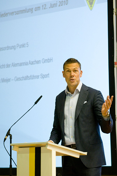 In der Folgezeit standen die finanzielle Situation und die Mehrbelastung aus dem Stadionbau im Mittelpunkt der Versammlung. GmbH-Geschäftsführer Frithjof Kraemer stellte die Bilanz des Geschäftsjahres 2009 vor. Wirtschaftsprüfer Frank Wettstein erläuterte das Sanierungskonzept, auf dessen Grundlage die GmbH die Bürgschaft der Stadt Aachen erhalten hatte. Für den Aufsichtsrat erinnerte dessen Vorsitzender Dr. Jürgen Linden an die strategischen Maßnahmen, die im Vorfeld des Stadionbaus getroffen wurden. Weil der Kostenrahmen von 50 Millionen Euro als Folge der Landesbürgschaft nicht überschritten werden durfte, habe man versucht, Nebenkosten aus dem laufenden Etat zu decken. "Die gewünschte Deckung ist nicht eingetreten. Vielleicht war unsere Vorgehensweise hinsichtlich der Nebenkosten zu optimistisch", gestand Linden ein.