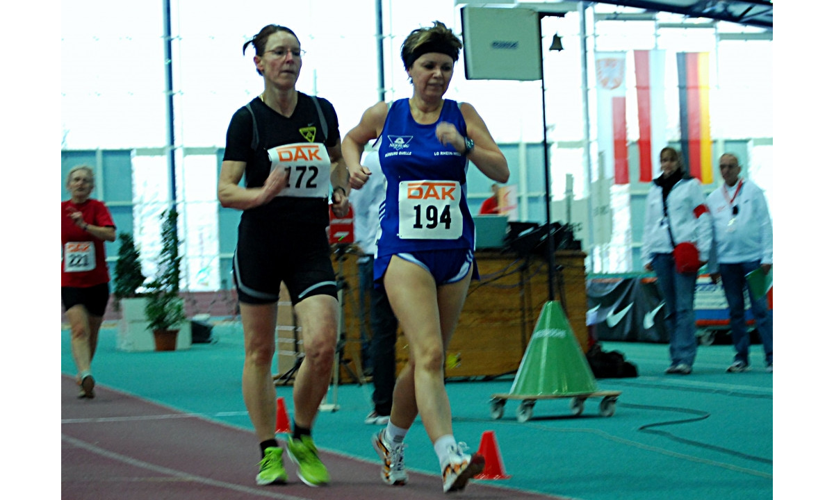Ursprünglich wollten die Geher der Alemannia zu fünft in Frankfurt bei den Deutschen Seniorenhallenmeisterschaften im Gehen, die zusammen mit den Dt. Hallenmehrkampfmeisterschaften ausgetragen wurden, am Start sein, wetterungsbedingt und aus familiären Gründen musste schließlich aber ein Athlet zu Hause bleiben. So war es letztlich an Marion Fuchs (W50), Peter Schumm (M65), Jan Ruppert (M45) und Malte Strunk (M35), die Fahnen des westlichsten Gehervereins Deutschlands auf dem 15 mal zu umrundenden 200 m-Oval hoch zu halten. Als erste war Marion Fuchs an der Reihe. Trotz zu schneller 600 m konnte Marion ihre Bestzeit auf 17:00,39 min drücken und wurde damit überlegen Deutsche Seniorenhallenmeisterin im 3.000 m Bahngehen ihrer AK. Die erste 16er-Zeit sollte damit nur noch eine Frage der Zeit sein.