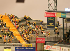 Zur Halbzeit der Bauarbeiten hat das Team um Gellings jetzt das Werk präsentiert. Bei genauerem Blick wird klar, warum dieses Modell einzigartig ist: Jede Figur besitzt ein handbemaltes Outfit, einzelne LED-Leuchten ersetzen das Flutlicht und im S-Block flackern Bengalische Feuer. Jedes Detail stimmt, alles ist perfekt dem Vorbild nachgeahmt. „Der Tivoli hat es verdient, ein Denkmal zu bekommen. Dieses Modell wird ihm viel gerechter als eindimensionale Fotos oder Bilder“, erklärt Gellings. Und wahrhaftig überzeugt das Modell nicht nur durch die bis auf die Rostflecke haargenaue Imitation. Denn durch Rauch, Fangesänge und Einspieler auf der Mini-Videowand lebt der Nachbau die pure Alemannia-Stimmung. Viele dieser Effekte sind zwar noch Zukunftsmusik, aber bis zum Sommer soll der Mini-Tivoli vollendet sein. Auf dem Rasen soll die historische Szene im Pokalspiel gegen Bayern München entstehen: Stefan Blank erzielt das 1:0 in der 33. Minute. 20 000 Zuschauer werden ihrer Mannschaft dann zujubeln. Aber auch auswechselbare Spielszenen sind denkbar.