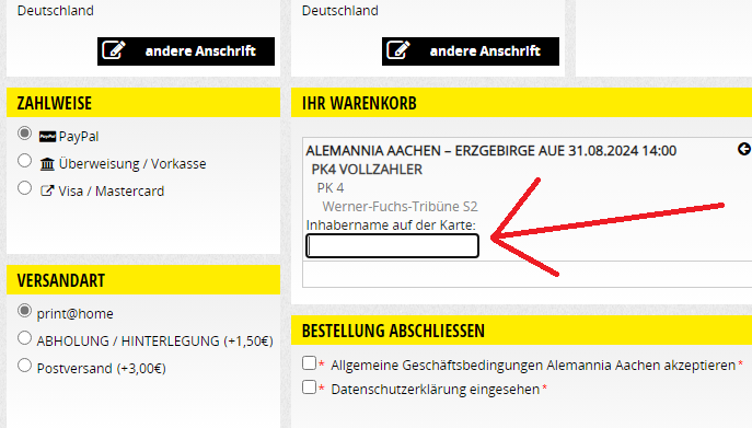 ACHTUNG: Tickets gelten ab sofort am jeweiligen Spieltag als Fahrausweis zum Tivoli und zurück in AVV-Verkehrsmitteln (2. Klasse) innerhalb der Städteregion Aachen. Bei print@home-Tickets ist hierfür ab dem Spiel gegen Aue eine Personalisierung zwingend erforderlich. Diese muss beim Online-Kauf vor Abschicken der Bestellung im Warenkorb unter „Inhabername auf der Karte“ selbst eingetragen werden.