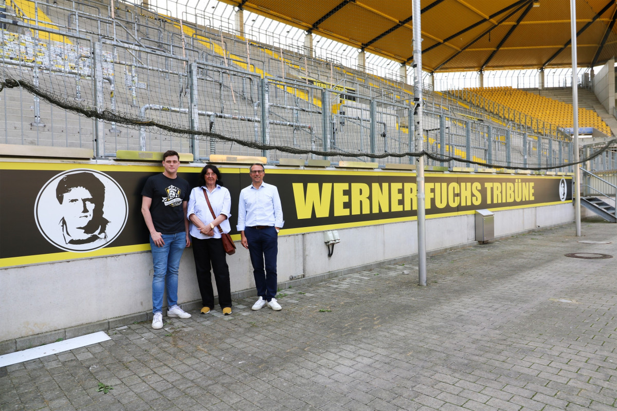 „Das ist eine tolle Geste der Alemannia, Werner wird sich da oben sicher riesig darüber freuen“, bedankt sich Monika Fuchs bei der Alemannia für die Umbenennung der Stehplatztribüne auf dem Aachener Tivoli in Werner Fuchs Tribüne. Zusammen mit Alemannia-Geschäftsführer Martin Bader und Chris Nießen von der Karlsbande Ultras, der das Design der Banden entworfen hat, hat sie heute die Tribüne offiziell eingeweiht.