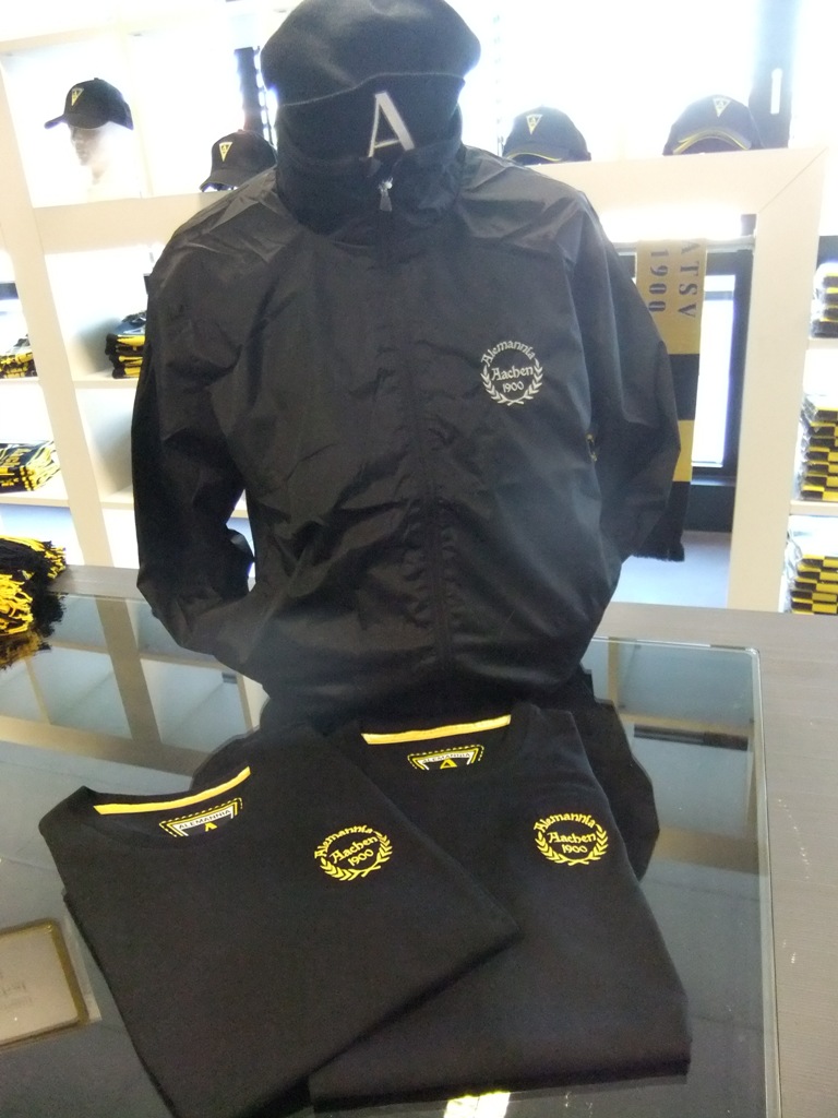Im Fanshop am Tivoli sind neue Artikel eingetroffen. Die dezent in schwarz gehaltene Jacke ist zum Preis von 59,99 Euro erhältlich. Das T-Shirt in den Vereinsfarben gibt es für 22,50 Euro. Das Fanshop-Team freut sich über Ihren Besuch.