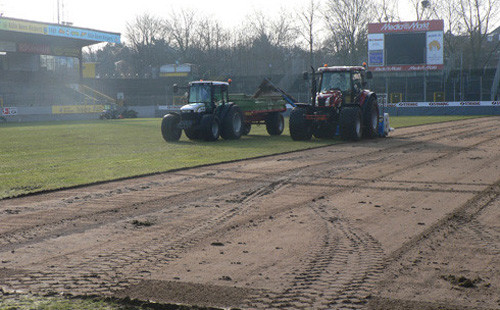 Die Doppelbelastung durch die Spiele von Profis und Amateuren hat dem Geläuf so sehr geschadet, dass der Austausch nötig wurde. Die arktischen Temperaturen rund um den Jahreswechsel haben ebenfalls ihren Teil dazu beigetragen, dass die Situation sich nicht verbessert. Aufgrund des Eigengewichtes wird der Rasen auf beiden Plätzen sofort nach dem Verlegen bespielbar sein.
