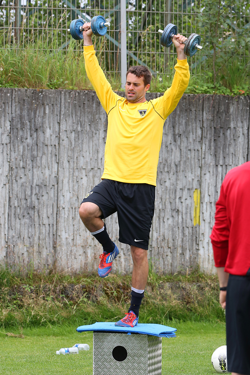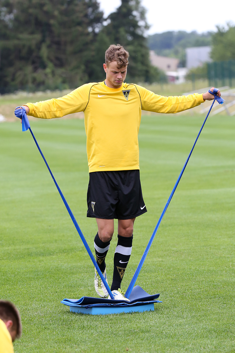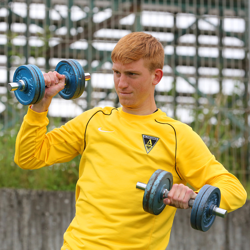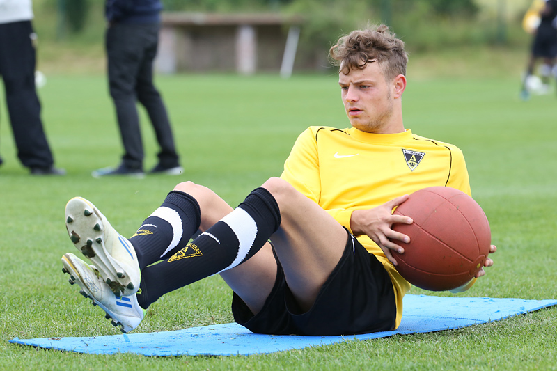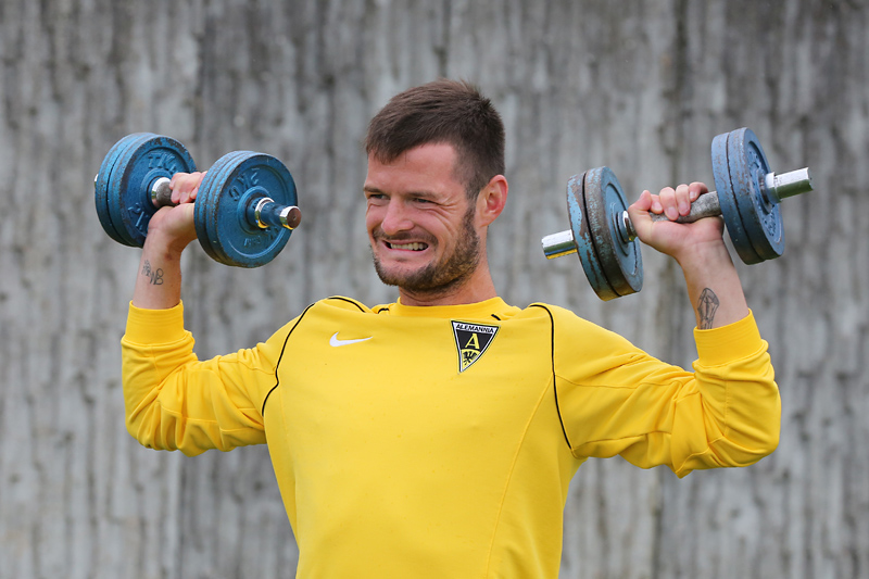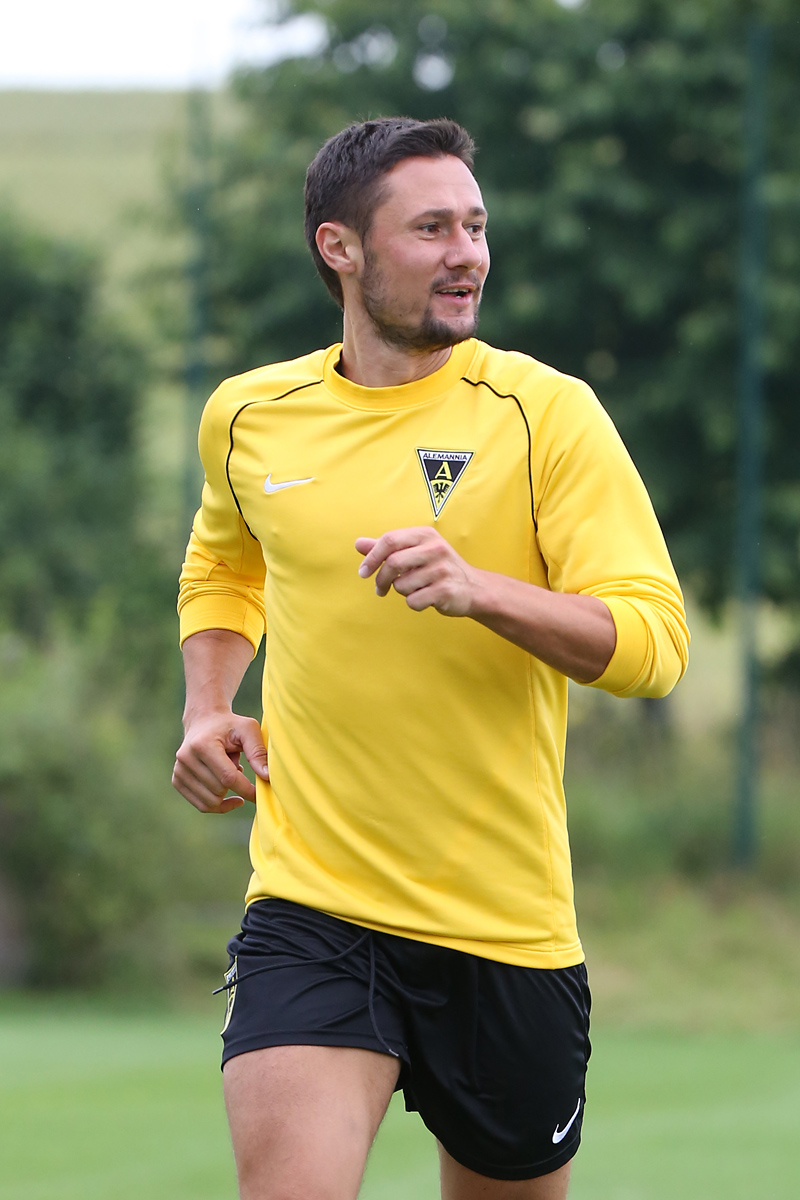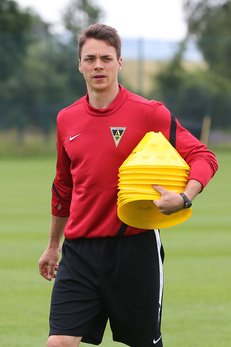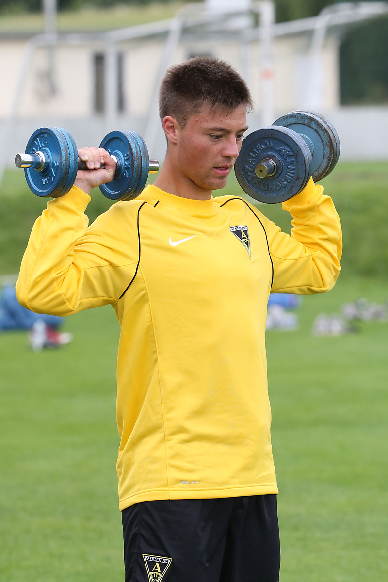 Seine Tempodribblings fallen dem Beobachter unmittelbar ins Auge. Es sieht fast schon leichtfüßig aus, wie „Ötzi“ auf dem Platz unterwegs ist. Und das, obwohl die Mannschaft in diesen Tagen ordentlich ins Schwitzen kommt. Morgens vor dem Frühstück werden die Laufschuhe geschnürt, um 10:30 Uhr steht die erste Einheit auf dem Platz an, um 16:30 Uhr bittet das Trainerteam zur dritten Einheit am Tag. Das Programm ist straff, die Intensität hoch: Zirkeltraining, kleinere Spielformen und Torschusstraining standen am Montag auf dem Plan. Kein Wunder, dass die Beine bei den meisten derzeit schwer sind. Dementsprechend haben Alemannias Physiotherapeuten, deren Massagebänke von morgens bis abends belegt sind, momentan alle Hände voll zu tun.