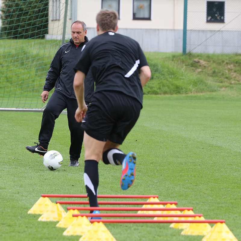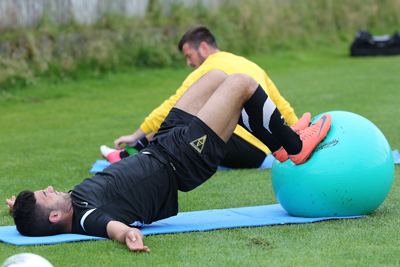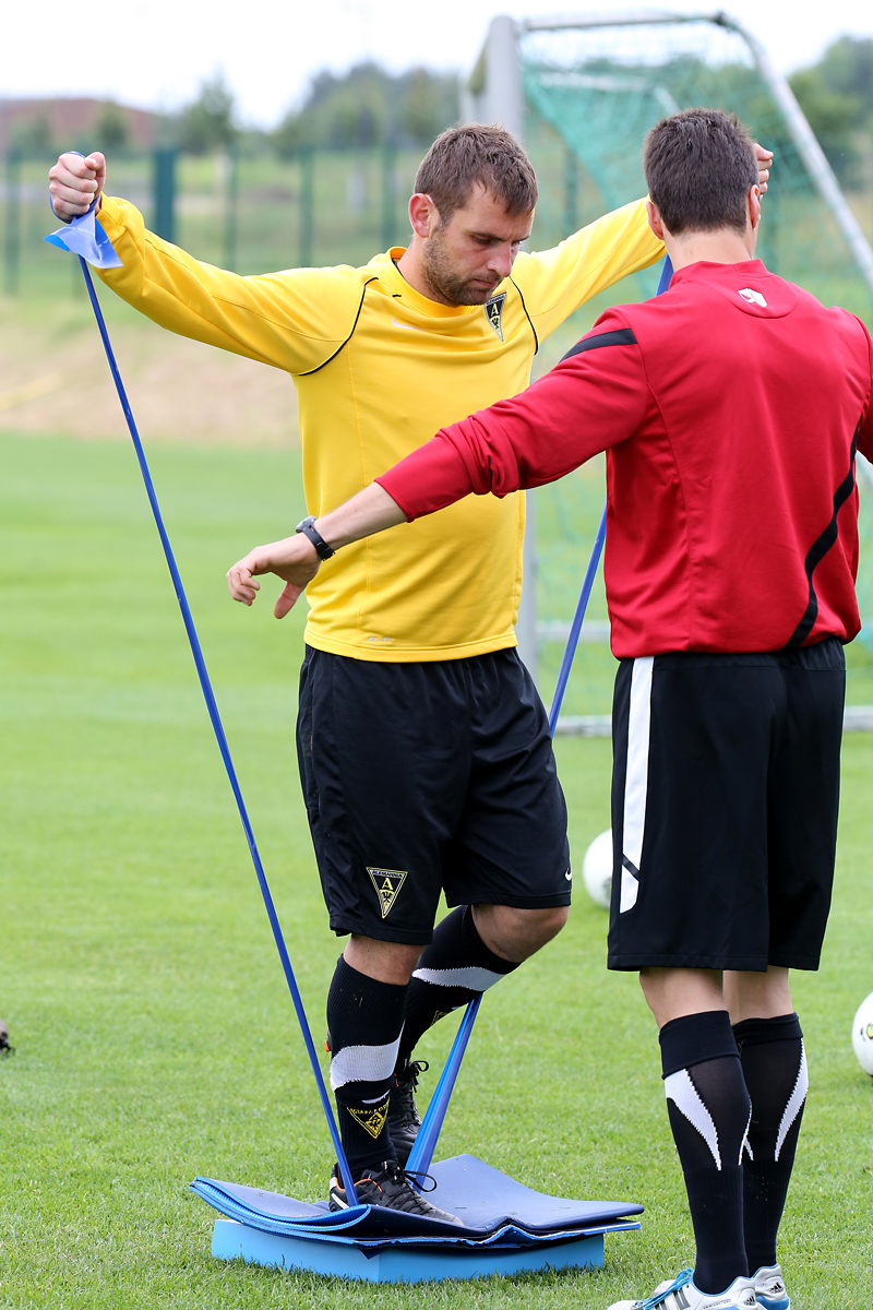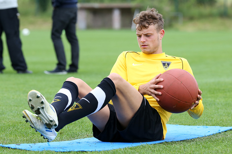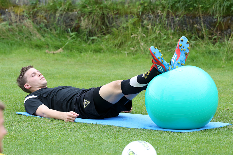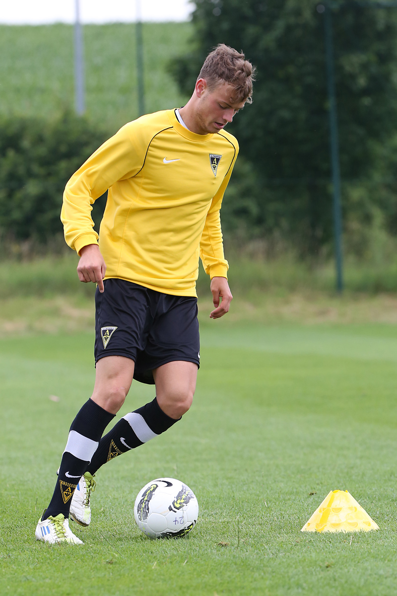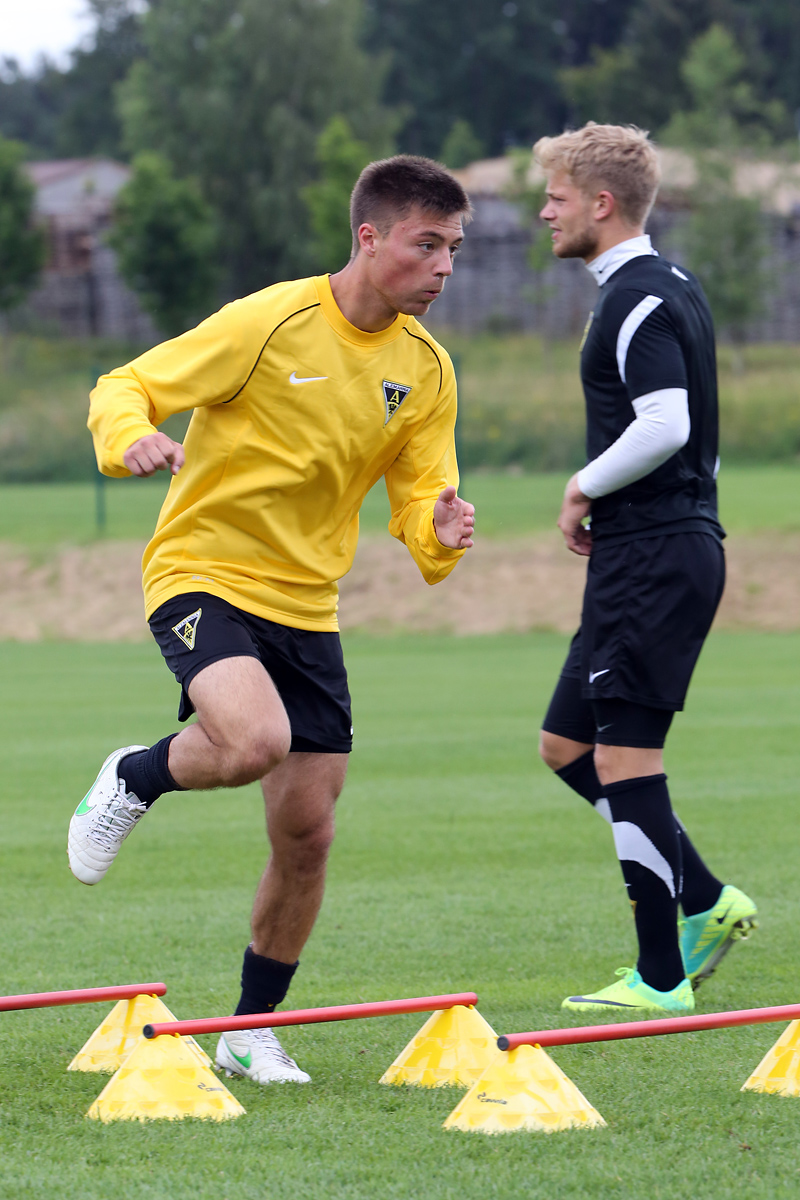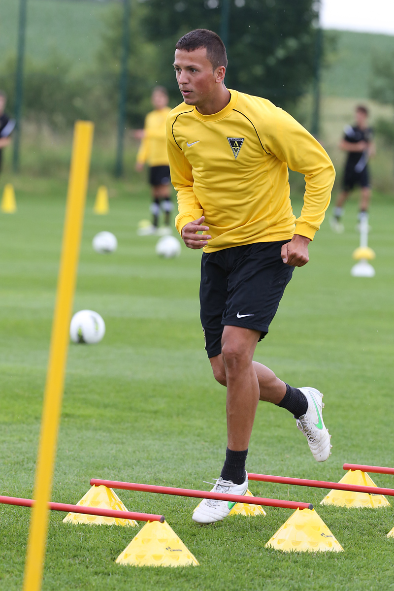 Seine Tempodribblings fallen dem Beobachter unmittelbar ins Auge. Es sieht fast schon leichtfüßig aus, wie „Ötzi“ auf dem Platz unterwegs ist. Und das, obwohl die Mannschaft in diesen Tagen ordentlich ins Schwitzen kommt. Morgens vor dem Frühstück werden die Laufschuhe geschnürt, um 10:30 Uhr steht die erste Einheit auf dem Platz an, um 16:30 Uhr bittet das Trainerteam zur dritten Einheit am Tag. Das Programm ist straff, die Intensität hoch: Zirkeltraining, kleinere Spielformen und Torschusstraining standen am Montag auf dem Plan. Kein Wunder, dass die Beine bei den meisten derzeit schwer sind. Dementsprechend haben Alemannias Physiotherapeuten, deren Massagebänke von morgens bis abends belegt sind, momentan alle Hände voll zu tun.