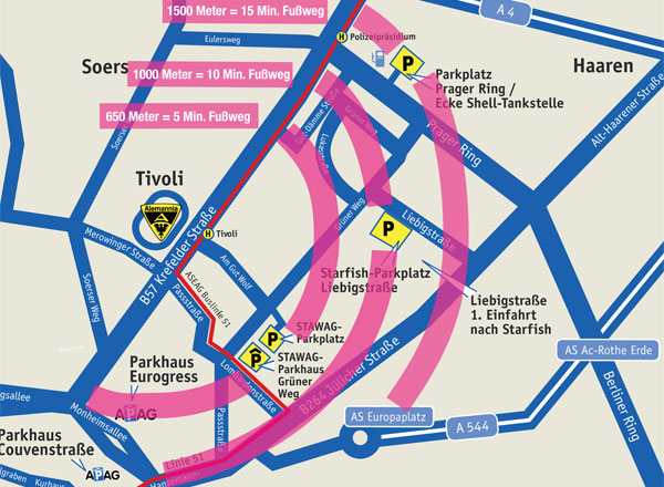 „Leider ist zu erwarten, dass viele Fans mit dem PKW anreisen werden, dennoch empfehlen wir noch einmal dringend, auf das Angebot der öffentlichen Verkehrsmittel zurück zugreifen“, so Stephan van der Kooi, Projektleiter Stadionneubau. Für all diejenigen, denen es nicht möglich ist, mit dem Bus anzureisen, weist Alemannia Aachen darauf hin, dass die Parkflächen der Einzelhändler im Bereich der Krefelder Straße am Dienstagnachmittag nicht zur Verfügung stehen. Die APAG hält jedoch genügend Parkplätze im Bereich Grüner Weg und Prager Ring bereit, die sich lediglich fünf bis zehn Minuten Fußweg vom Stadion entfernt befinden.