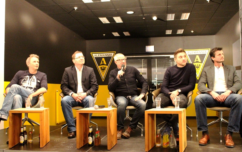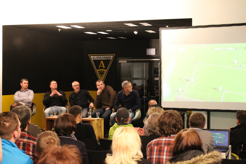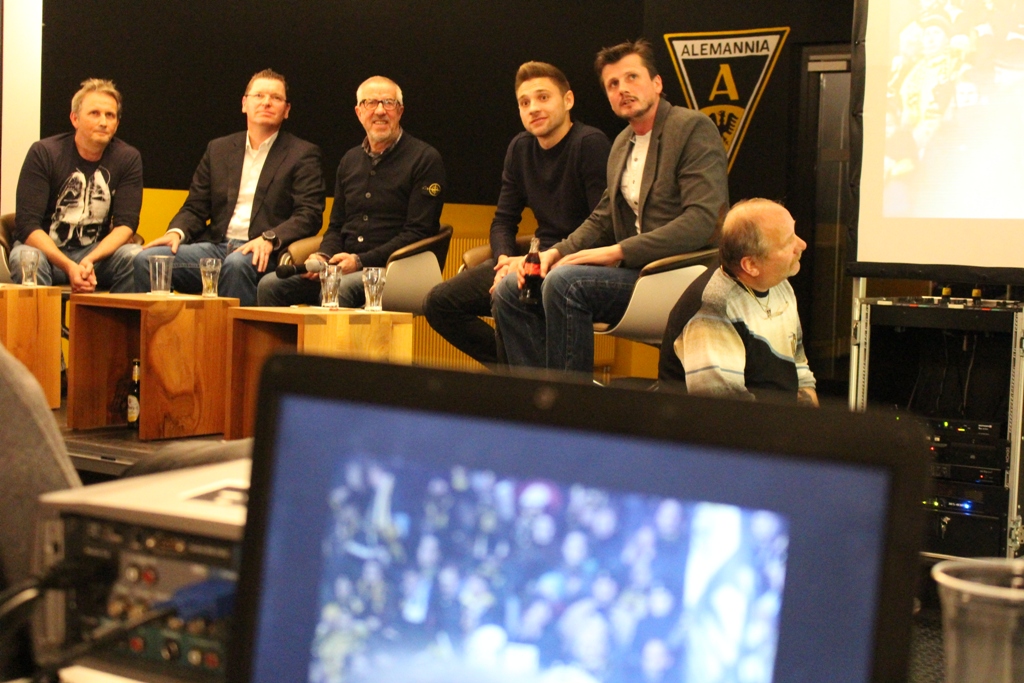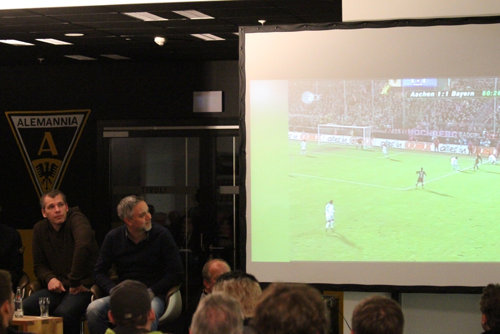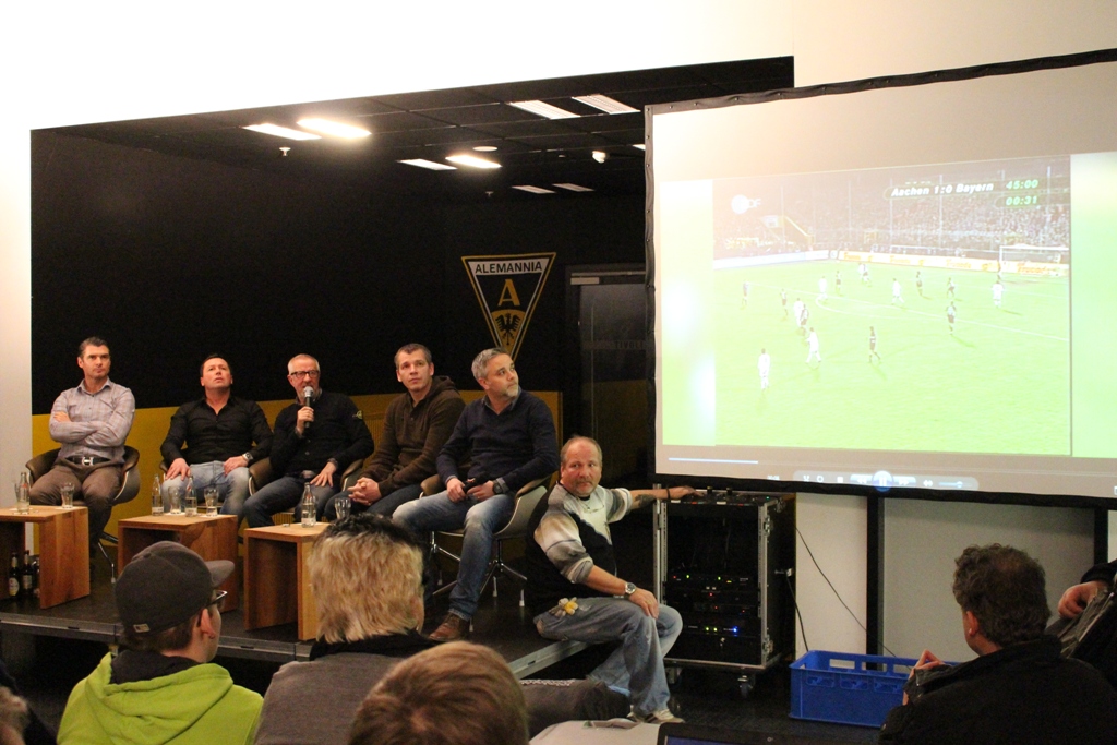 Von der damaligen Mannschaft waren Kapitän Karlheinz Pflipsen, Torwart Stephan Straub und Publikumsliebling Willi Landgraf zu Gast, die gemeinsam mit Kolumnist und Alemannia-Fan Sascha Theisen auf den legendären Pokalabend zurückblickten. „Der Schuss vom Blanki war nicht haltbar – basta“, witzelte Landgraf. „Wir haben früher die Molten-Bälle so hart aufgepumpt, dass der Gegner immer Probleme hatte. Wir kannten die Dinger, die waren steinhart“, und lieferte gleich die Erklärung, warum die Oliver Kahn die Flugkurve des Balls nicht einschätzen konnte.