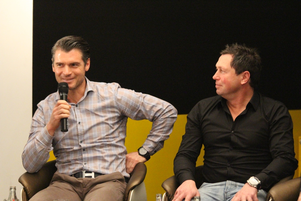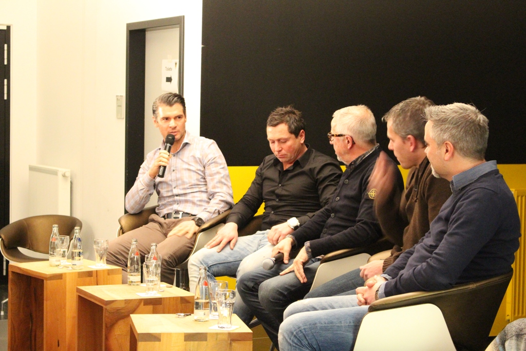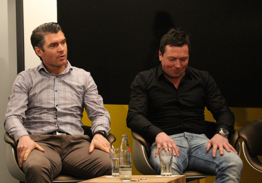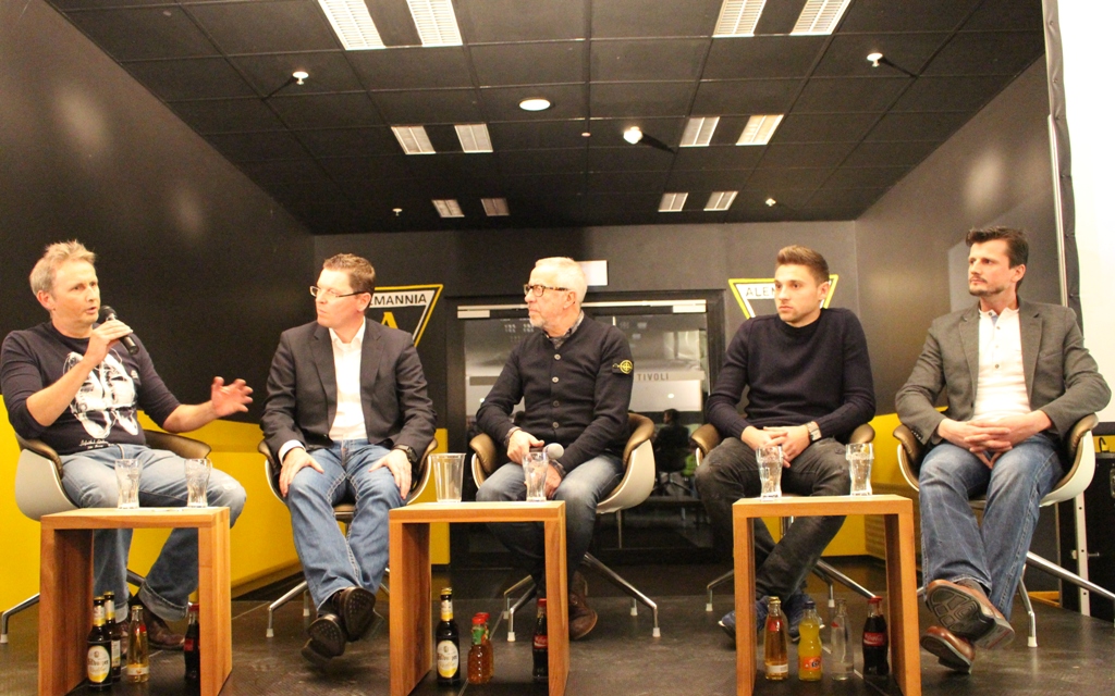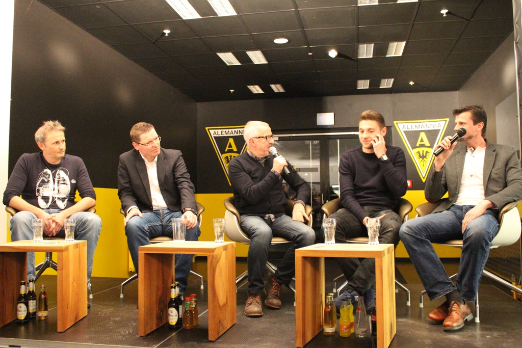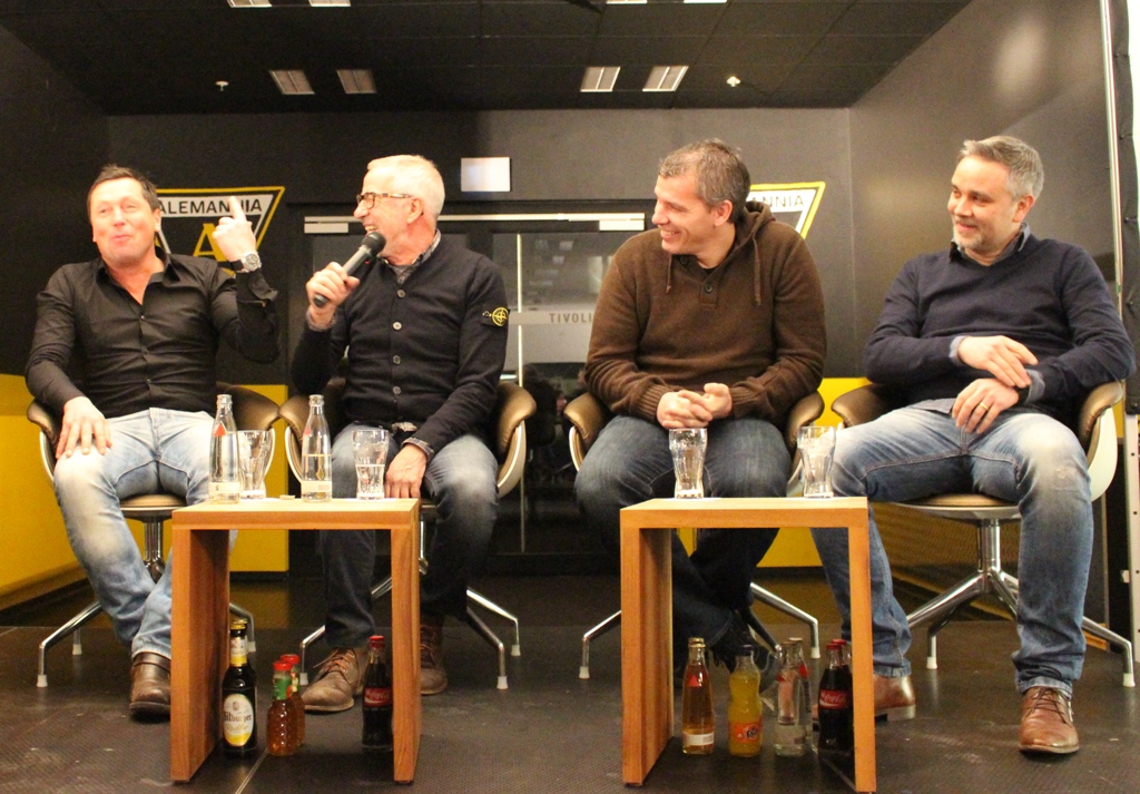 Von der damaligen Mannschaft waren Kapitän Karlheinz Pflipsen, Torwart Stephan Straub und Publikumsliebling Willi Landgraf zu Gast, die gemeinsam mit Kolumnist und Alemannia-Fan Sascha Theisen auf den legendären Pokalabend zurückblickten. „Der Schuss vom Blanki war nicht haltbar – basta“, witzelte Landgraf. „Wir haben früher die Molten-Bälle so hart aufgepumpt, dass der Gegner immer Probleme hatte. Wir kannten die Dinger, die waren steinhart“, und lieferte gleich die Erklärung, warum die Oliver Kahn die Flugkurve des Balls nicht einschätzen konnte.