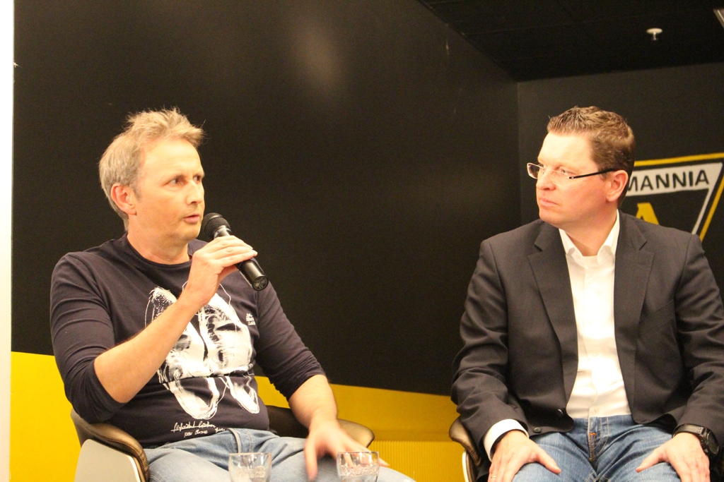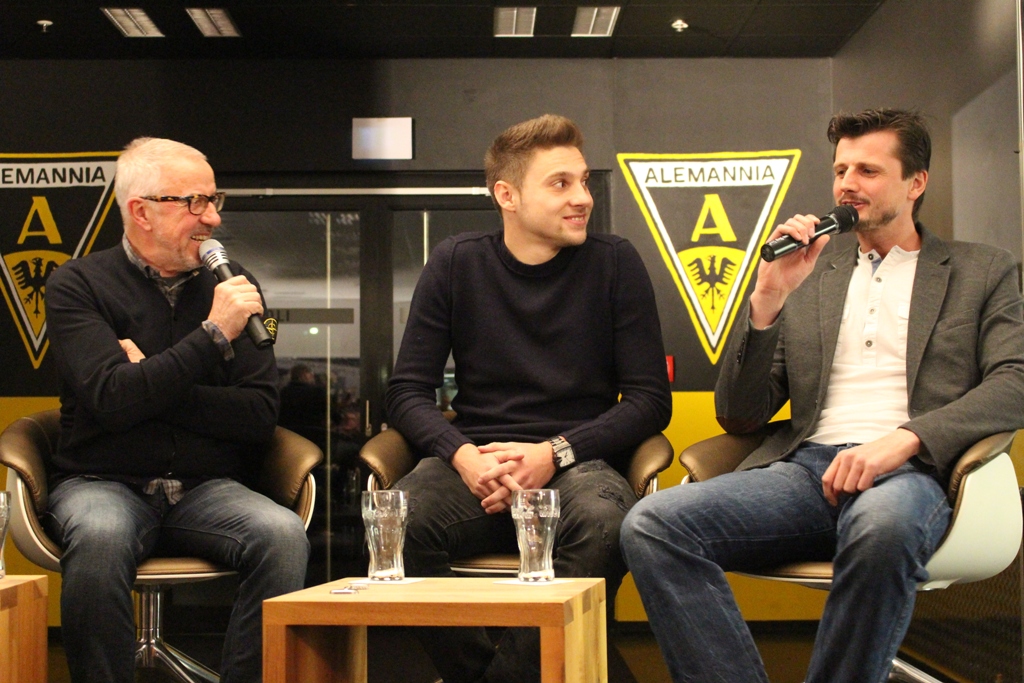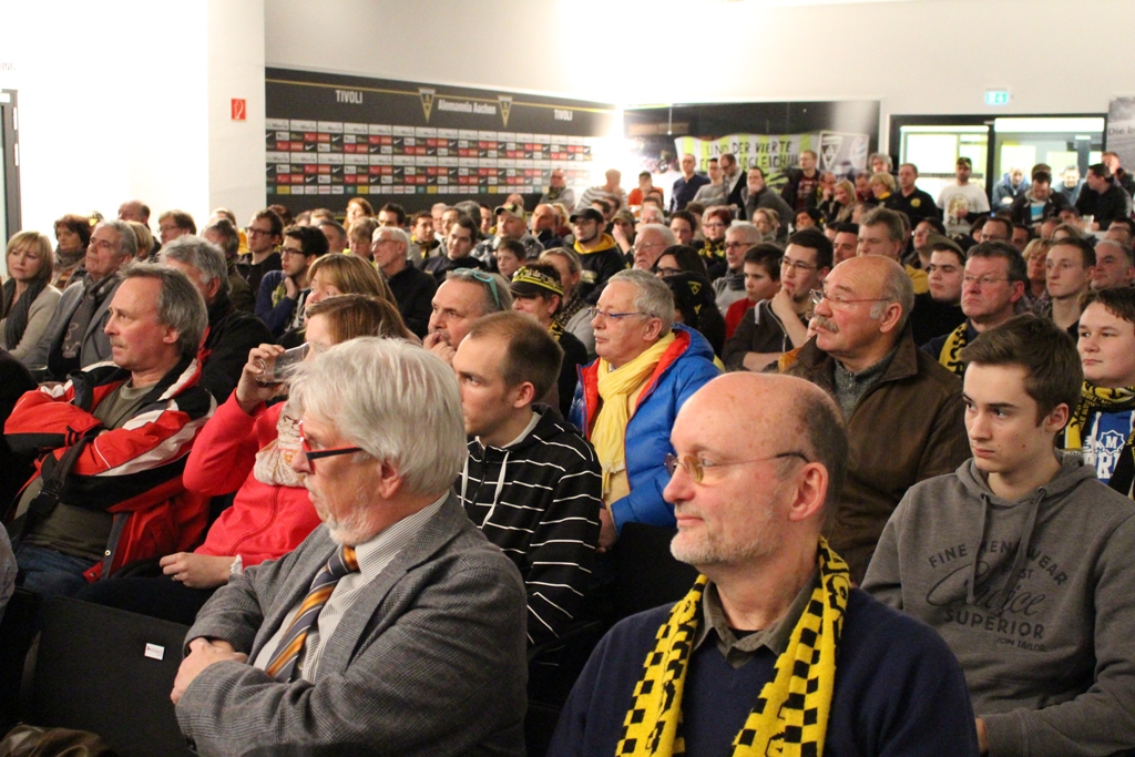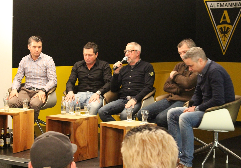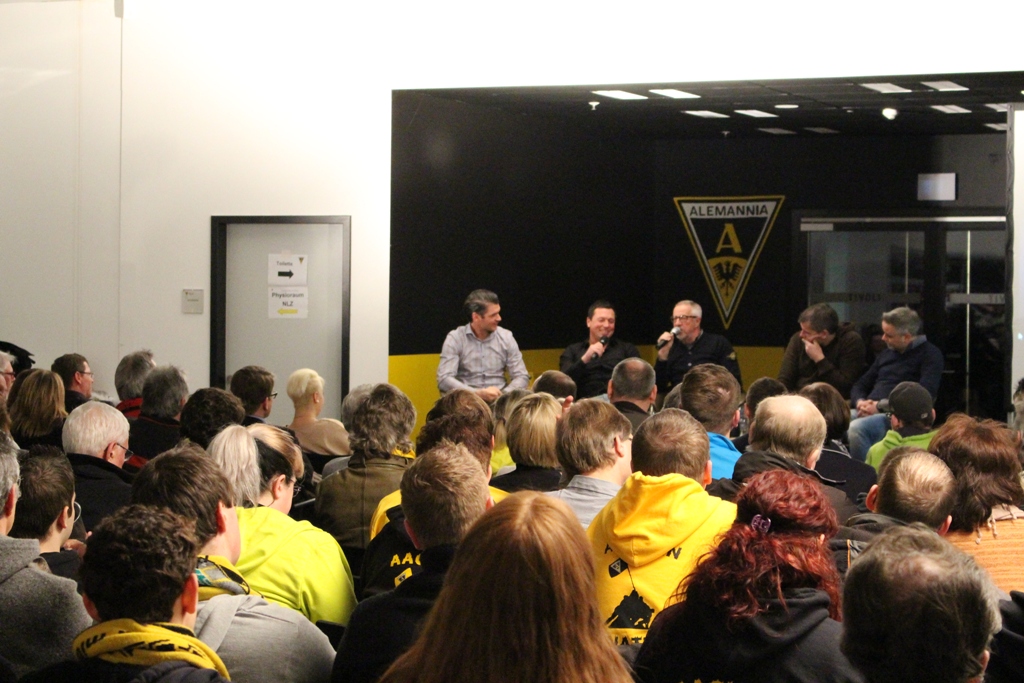Aber nicht nur die Vergangenheit sollte an diesem Abend beleuchtet werden. Nach dem Motto „Gestern. Heute. Morgen.“ ging es im zweiten Teil um die aktuelle Situation des Klubs und einen Ausblick in die Zukunft. Vom Regionalliga-Team der Alemannia waren Co-Trainer Reiner Plaßhenrich und Sasa Strujic gekommen. Christoph Pauli (Zeitungsverlag Aachen) und Thomas Deutz, der auf der JHV für das Amt des Vize-Präsidenten kandidiert, stellten sich ebenfalls den Fragen von Stadionsprecher Robert Moonen. Einig waren sich am Ende alle in einem Punkt: „Nur wenn Ruhe in den Verein einkehrt, kann dauerhaft wieder erfolgreich gearbeitet werden.“