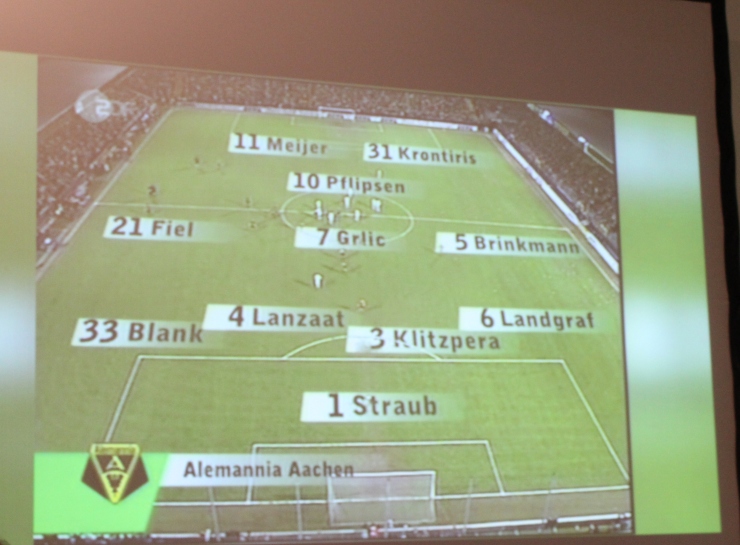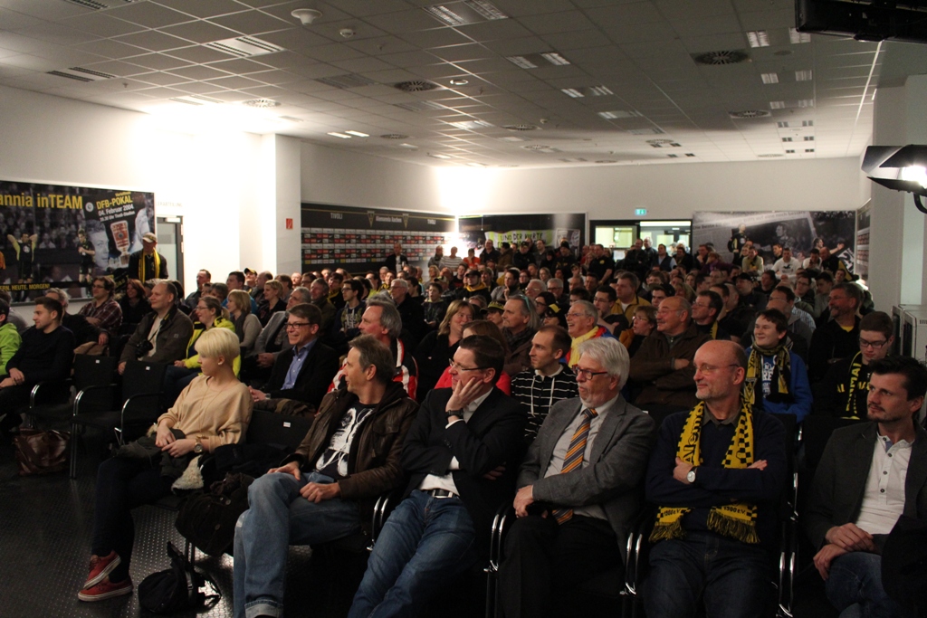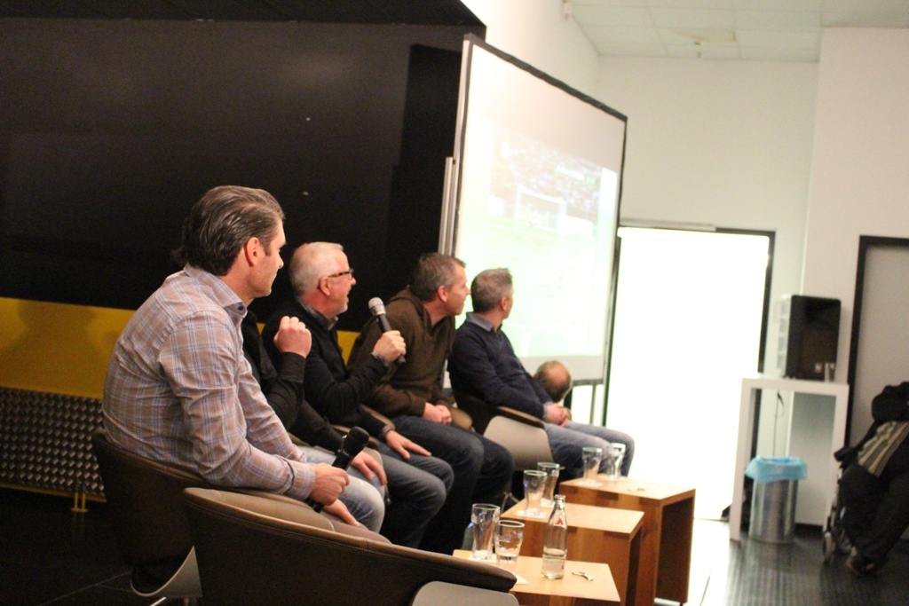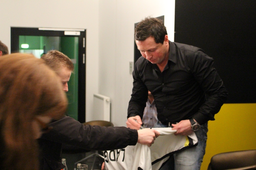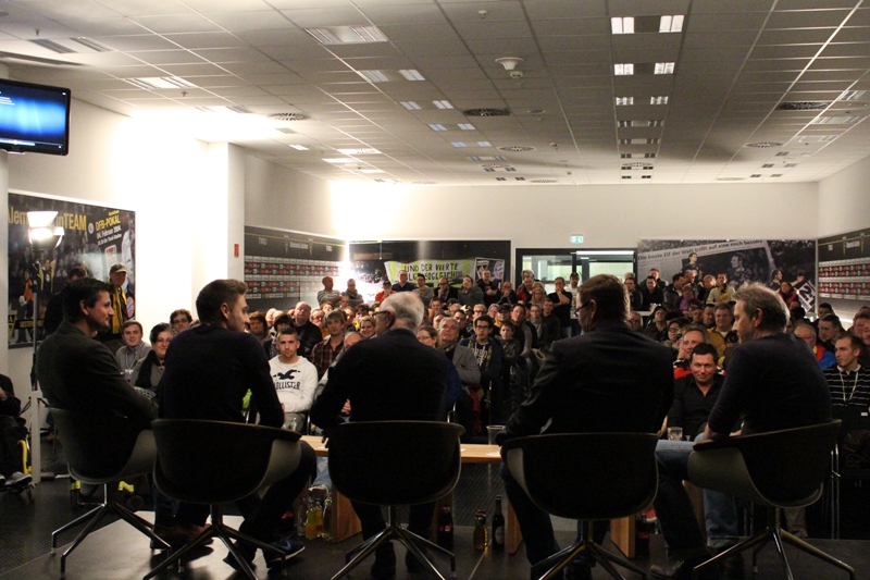 Aber nicht nur die Vergangenheit sollte an diesem Abend beleuchtet werden. Nach dem Motto „Gestern. Heute. Morgen.“ ging es im zweiten Teil um die aktuelle Situation des Klubs und einen Ausblick in die Zukunft. Vom Regionalliga-Team der Alemannia waren Co-Trainer Reiner Plaßhenrich und Sasa Strujic gekommen. Christoph Pauli (Zeitungsverlag Aachen) und Thomas Deutz, der auf der JHV für das Amt des Vize-Präsidenten kandidiert, stellten sich ebenfalls den Fragen von Stadionsprecher Robert Moonen. Einig waren sich am Ende alle in einem Punkt: „Nur wenn Ruhe in den Verein einkehrt, kann dauerhaft wieder erfolgreich gearbeitet werden.“