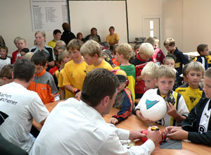 Coach Dieter Hecking und seine Torhüter Kristian Nicht und Stephan Straub standen den Kids Rede und Antwort. Im Presseraum der Alemannia durften die Nachwuchskicker nach Herzenslust Fragen stellen: „Herr Hecking, wer ist ihre Nr. 1 im ersten Saisonspiel?“ „Wir haben zwei sehr gute Torhüter, wobei Kristian Nicht durch die gezeigten Leistungen einen Vorsprung gegenüber Stephan Straub hat, der ja acht Monate verletzt war“, antwortete Hecking.
