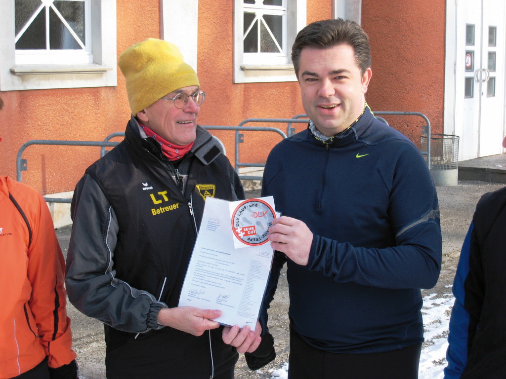 Bei klirrender Kälte und strahlendem Sonnenschein wurde das Zertifikat samt Qualitätssiegel durch den Kreisvorsitzenden des Leichtathletikverbandes, Dirk Bartholomy, im Waldstadion dem Lauftreff im Rahmen des sonntäglichen Treffens überreicht. Gewürdigt wurde die breite Aufstellung des Lauftreffs, denn für jeden Teilnehmer steht das richtige Angebot zur Verfügung: Vom Anfänger bis zum engagierten Läufer werden entsprechende Gruppen angeboten. In der Stunde legen die Läufer Strecken zwischen 6,5 und 11,5 km zurück. Wer (noch) nicht eine Stunde laufen kann, für den werden Gruppen in Walking und Nordic-Walking angeboten. Jede Gruppe wird von einem vom DLV ausgebildeten Betreuer professionell durch den Wald geführt. Die Teilnahme an allen Angeboten ist kostenfrei. Auch in der Woche trifft man sich zu verschiedenen Terminen zum Laufen/Walken im Waldstadion. Wer Volleyball spielen möchte, kann dies freitags machen.